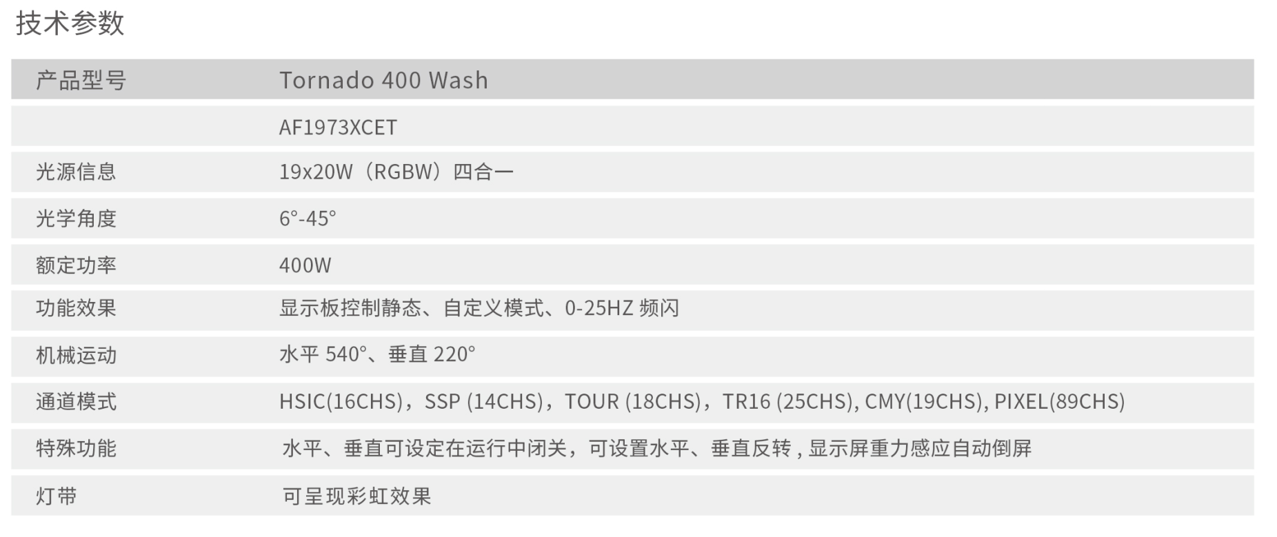 Tornado 400 Wash具有高光效混色均匀轻巧的IP65防水摇头染色灯,带有像素环。拥有19个像素点控制的RGBW 20W LED,压铸铝散热和超静音防水风机结合的冷却系统可实现高效冷却,且几乎无噪音;搭载基于色彩模型的通道模式HSIC,可以更容易、精准锁定所需求的光色;为使多种颜色混色一致,搭载了黑科技CCS智能色彩管理系统,展现出完美的视觉效果。应用于主题公园、游乐场所、标志性建筑、建筑楼宇、户外演出等场所。