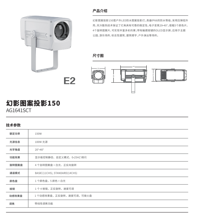 幻影图案投影150是户外LED防水图案投影灯,具备IP66的防水等级,采用压铸铝外壳,风冷散热技术保证了灯具具有可靠的稳定性。电子变焦20-40°。搭载5个颜色片,4个旋转图案片,可实现丰富多彩的效果;带有触摸按健的OLED显示屏,应用于主题公园、游乐场所、标志性建筑、建筑楼宇、户外演出等场所。