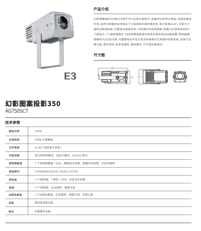幻影图案投影350是大功率户外LED防水投影灯,具备IP66的防水等级,采用压铸铝外壳、自然冷却散热技术保证了灯具具有可靠的稳定性。电子变焦8-40°,可用于大面积远距离投影;内置自动调焦系统,可快速将光斑调清晰;搭载CMY混色系统及7个颜色片,7个旋转图案片、动态效果盘棱镜可实现丰富多彩的动画效果;带有触摸按键的OLED显示屏,内置锂电池可在灯具没有接电时正常操作控制系统。应用于主题公园、游乐场所、标志性建筑、建筑楼宇、户外演出等场所。