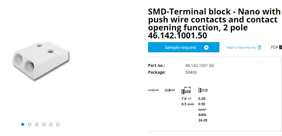 | Product name: | SMD-Terminal block - Nano with push wire contacts and contact opening function, 2 pole |