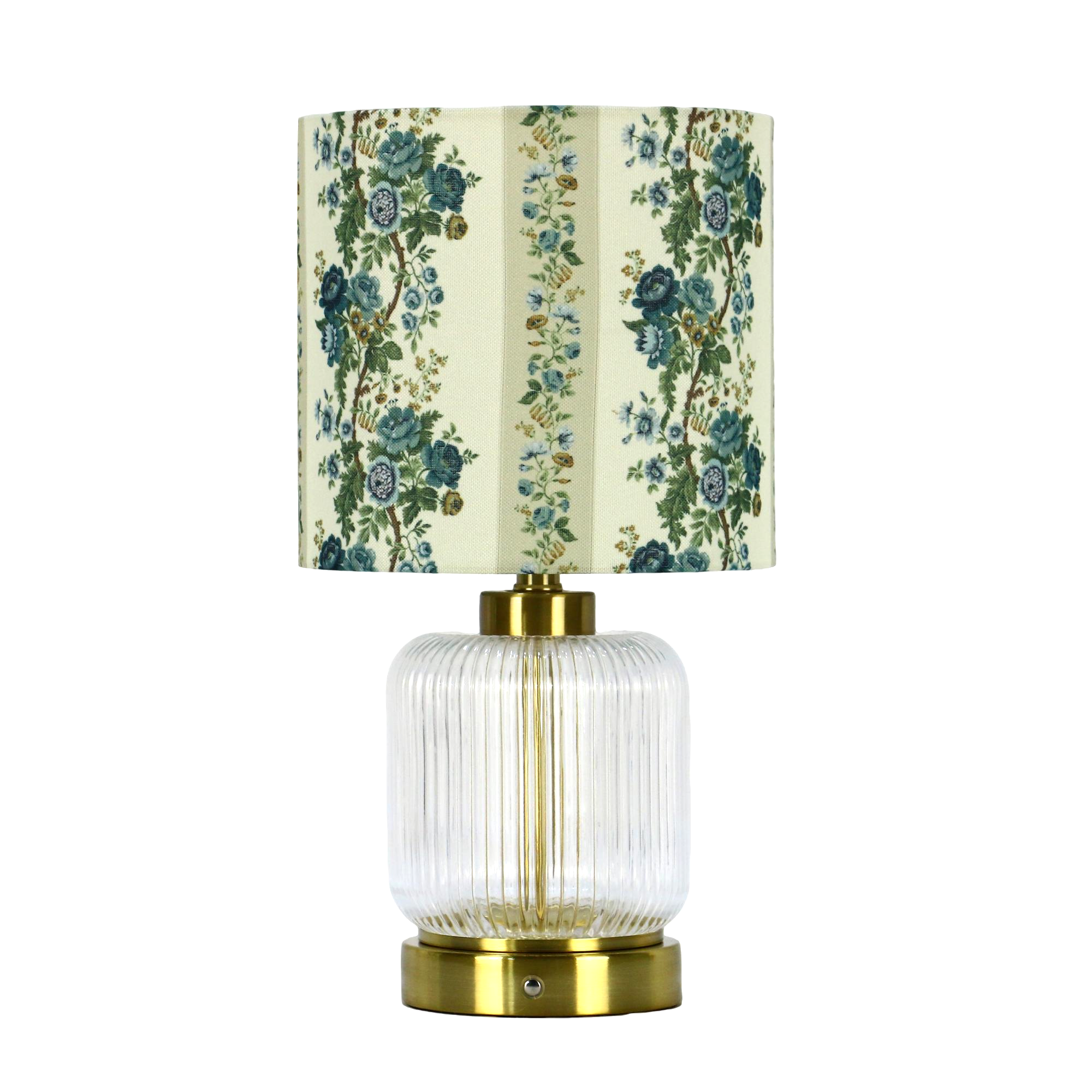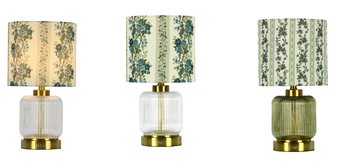 采用花卉藤蔓纹布艺灯罩+玻璃肌理底座+金色金属饰件,呈现法式轻奢/复古田园风格,灯罩含浅黄、浅绿、白底等多花色可选,透明/磨砂玻璃底座兼顾通透质感与优雅氛围,适配复古风、法式风等家居空间,既是照明工具也是桌面装饰单品。