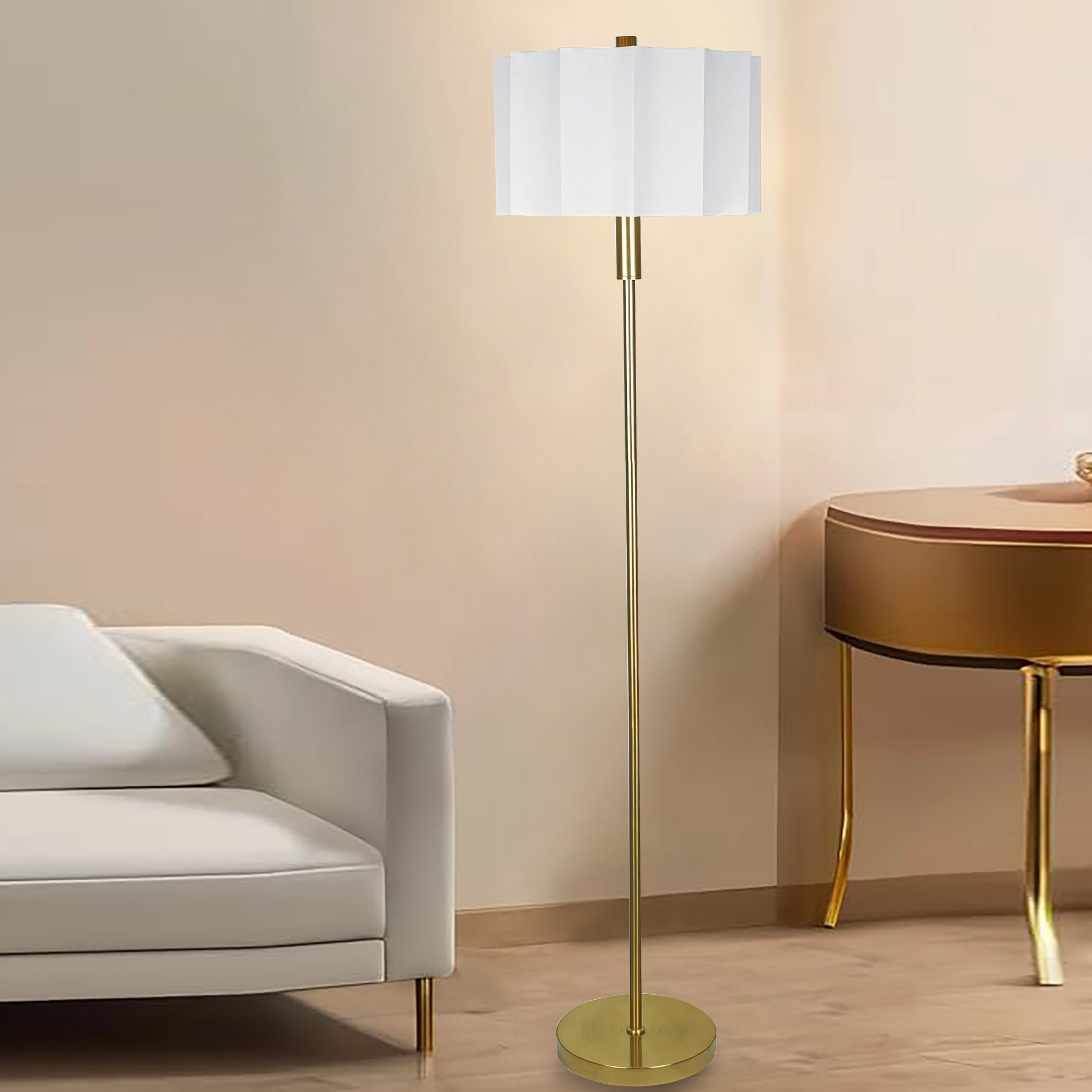 作为落地照明单品,适用于客厅沙发旁(辅助阅读)、卧室角落(营造氛围)、轻奢风空间的软装点缀,既提供局部照明,也能通过金色元素提升空间的精致感。