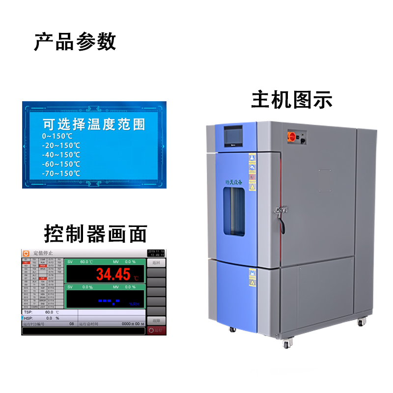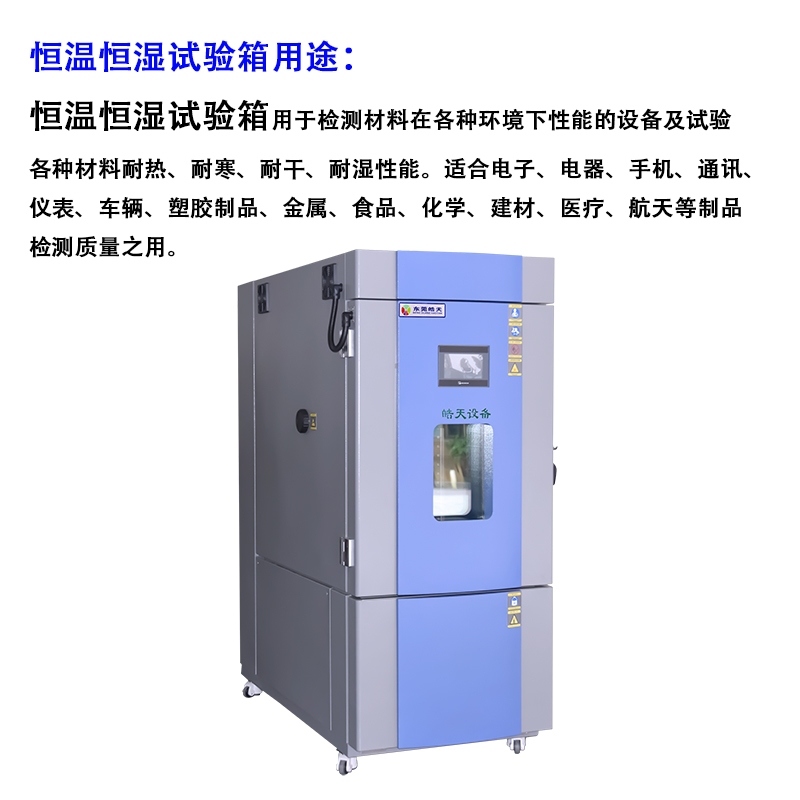 用来模拟产品在气候环境温湿组合条件下(高低温操作、储存、温度循环、高温高湿、低温低湿、结露试验等),应用于国防工业,航天工业,自动化零组件,汽车部件,电子电器零组件,仪器仪表、材料、塑胶,化工,食品,制药工业及相关产品之耐热,耐湿,耐寒,耐干性能及品质管理工程之试验规范,对试品在给定的环境条件下检测产品本身的适应能力与特性是否改变作出评价