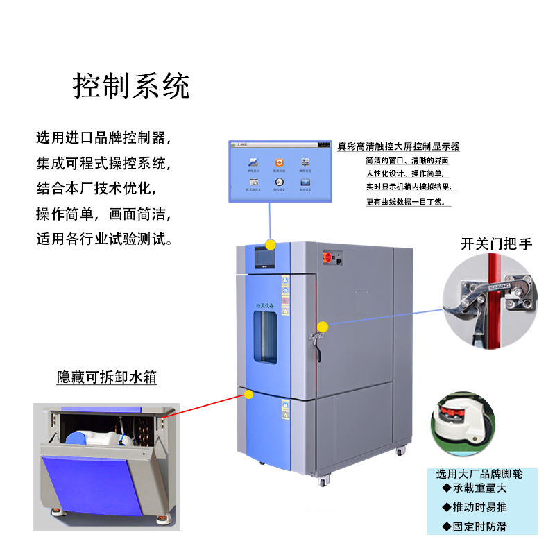 试验箱体设计完美,采用数控机床加工成型,并采用无反作用把手,试验箱操作容易。