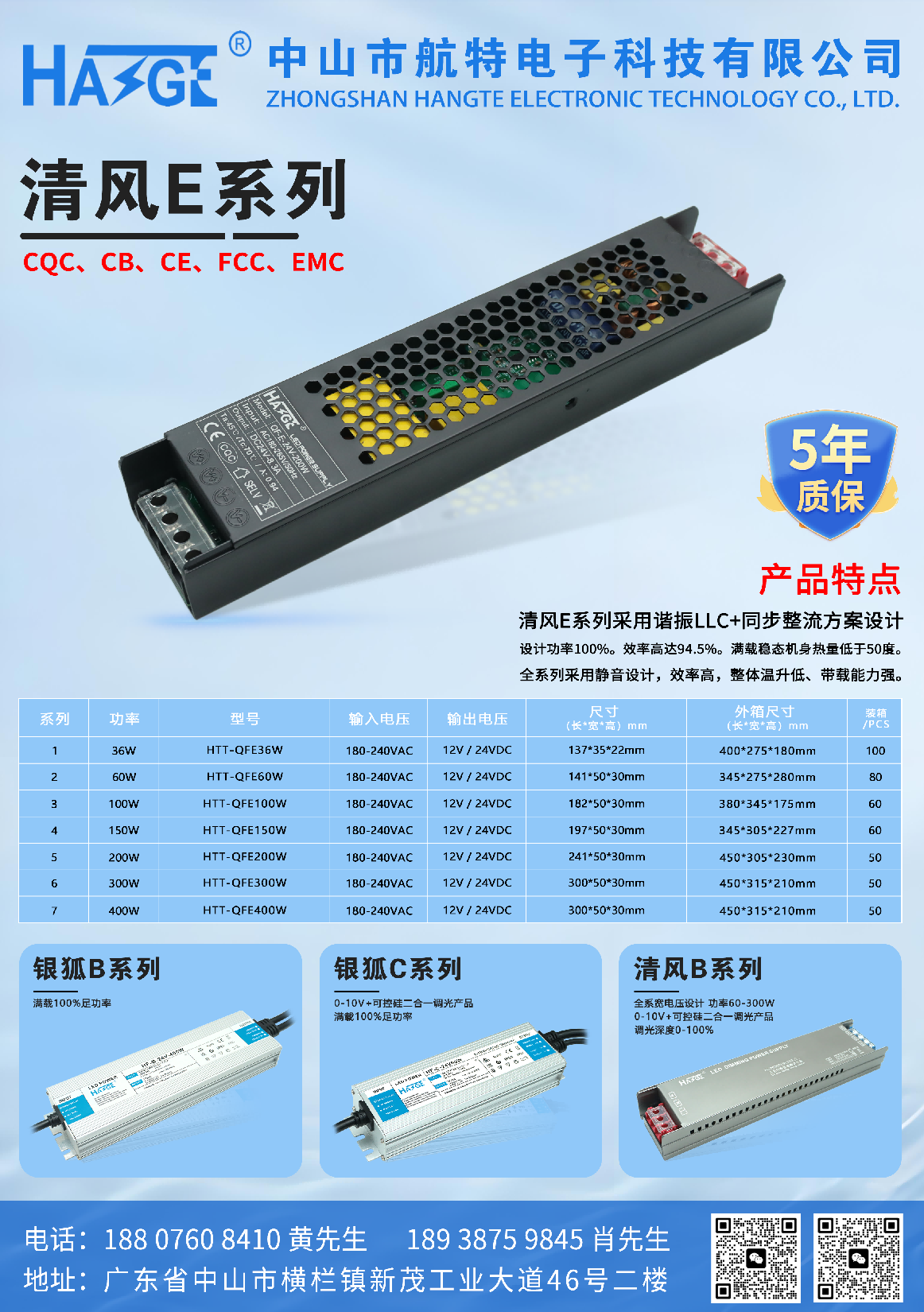 中山市航特电子科技有限公司成立于2012年,是一家集研发、生产销售、服务为一体的电源制造高新技术型企业。 公司主营:户外防水路灯电源 、室内恒压开关电源、户外亮化照明电源 以及 客户定 向开发OEM高端定制产 品 ,公司有完善 的研发团队、生产检测设备 ,产 品均选用优质原材料 ,并按照有关标准组织生产 。 公司全系列产 品通过 了TU V/CB/CE/KC等认证 ,产 品远销于韩 国 ,俄罗斯 ,西班牙 ,意大利 ,英 国 ,墨西哥、埃及 ,马来西亚、孟加拉 等海外多个国家和地区。 在瞬息万变 的市场环境 中公司以技术创新为突破口 ,诚信服务严格把控 品质质量为生存 ,依托公司技术优势 ,把全体员工 的个人价值观汇集成为 “ 诚信守法 ,创新 、注重绩效 ,不断变革精神风貌 ,为实现 “ 做全球具有影响力的电源制造商”的企业远景而奋斗!竭力给客户带来真诚服务 ,建立相互信任 ,解决客户问题 ,满足客户需求 的高质量服务 ,为服务宗 旨而努力。 公司对产品质量的严格监督把控 、产品外观结构符合高质量工艺标准 ,生产规范标准化 、规模化 、产品架构完善顺畅 客户对我们有完全信心 的首要 ,我们一直致力于此! Zhongshan Hangte Electronic Technology Co., Ltd. was established in 2012 as a high-tech enterprise specializing in the R&D, production, sales, and service of power supply manufacturing. The company primarily focuses on: outdoor waterproof streetlight power supplies, indoor constant-voltage switching power supplies, outdoor landscape lighting power supplies, and OEM high-end customized products developed according to client specifications. The company boasts a well-established R&D team and advanced production testing equipment. All products are manufactured using premium raw materials and adhere to relevant industry standards. The entire product line has obtained TüV, CB, CE, KC, and other certifications, with products exported to multiple overseas countries and regions, including South Korea, Russia, Spain, Italy, the UK, Mexico, Egypt, Malaysia, and Bangladesh. In the ever-changing market environment, the company has identified technological innovation as its breakthrough point, with integrity in service and strict quality control as the foundation for survival. Leveraging its technical expertise, the company unites the personal values of all employees into a collective ethos of "integrity, compliance, innovation, performance-driven mindset, and a relentless spirit of transformation." It strives toward the corporate vision of "becoming a globally influential power supply manufacturer," while dedicating itself to delivering sincere service, building mutual trust, solving customer challenges, and meeting client demands with high-quality service as its core mission. The company enforces rigorous quality supervision and control, ensuring that product appearance and structure meet high-quality craftsmanship standards. With standardized, large-scale production processes and a well-structured product framework, customer confidence in our offerings remains paramount—an objective we continuously strive to uphold.