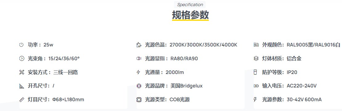 尺寸25/40/54/68mm、功率5W/8W/12W/15W/25W/35W,满足不同空间需求