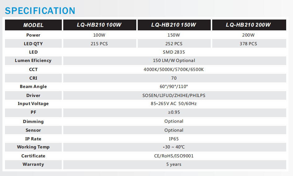 • 色温(k) ≤2800K、2801-3200K、3201-3800K、3801-4200K、4201-5000K、5001-6400K