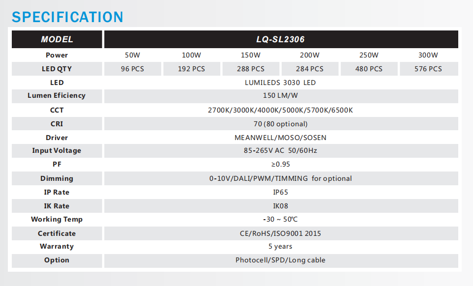 • 色温(k) ≤2800K、2801-3200K、3201-3800K、3801-4200K、5001-6500K、4201-5000K