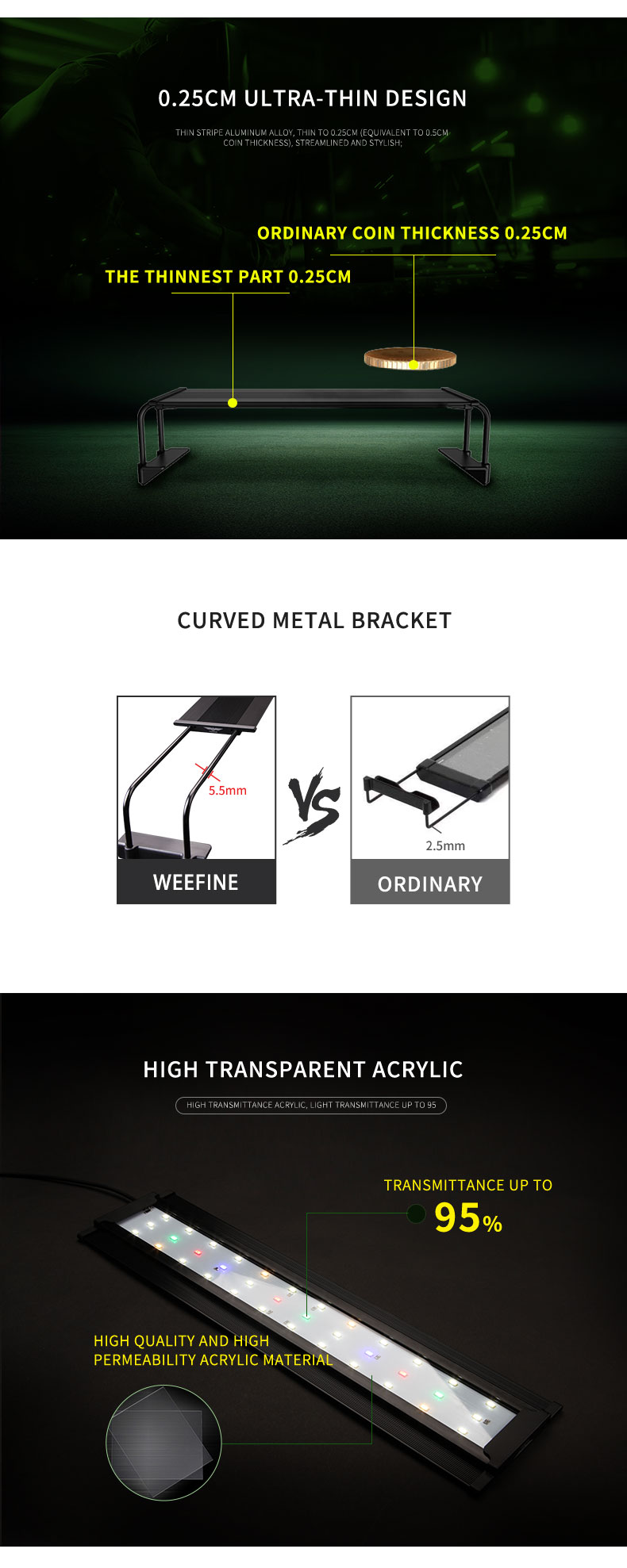 weefine已经是一家有着上百名员工的科技企业,连续两届被国家认定并授予了“国家高新技术企业”的称号,公司也拥有四个产品事业部及数百款产品,产品领域主要涉及水下照明、家居照明、汽车照明等领域。公司在广东省深圳市设立了自己的研发基地,目前研发中心有数十名经验丰富的工程师,主要从事外型设计、结构设计、光学设计、电子软件与硬件设计、APP设计和美术设计等;公司在广东省佛山市设立了自己的生产基地,目前有制造中心和加工中心,主要承担公司各类产品的加工、生产、装配、包装与出货的相关工作任务。公司非常注重人才的培养与产品的创新,建立了完善的人才激励制度,公司拥有数十项发明专利与新型应用技术专利,公司的多款产品曾在各类设计比赛中获得奖项,并深受客户与市场的喜爱与赞美。
