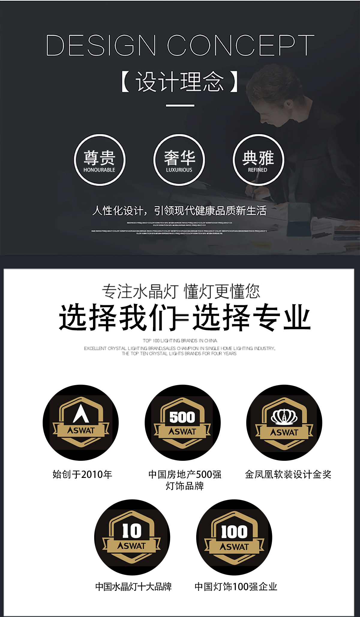 中山爱施华灯饰有限公司是一家集研发、生产、营销工一体的综合型灯饰企业公司,拥有众多国内外资深专业设计师,20000平方的现代生产基地。旗下拥有“爱施华”迪慕“两大品牌,涵盖欧式、法式、轻奢与高端定制产品线。先后在全国建立了100多家专卖店,600多家销售网点。销售网点遍布国内主要城市。产品远销中东、东南亚、欧美等国际市场。公司为自营销售、加盟经销、电子商务等多渠道营销推广模式,确立了公司在灯饰行业领先的品牌地位。先后获得了"优秀水晶灯品牌、家居水晶灯单品销售冠军.设计师首选品牌、行业十佳品牌”等众多荣誉称号。