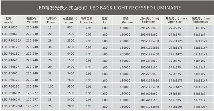 • 灯具尺寸 300*300mm、600*600mm、1200*600mm