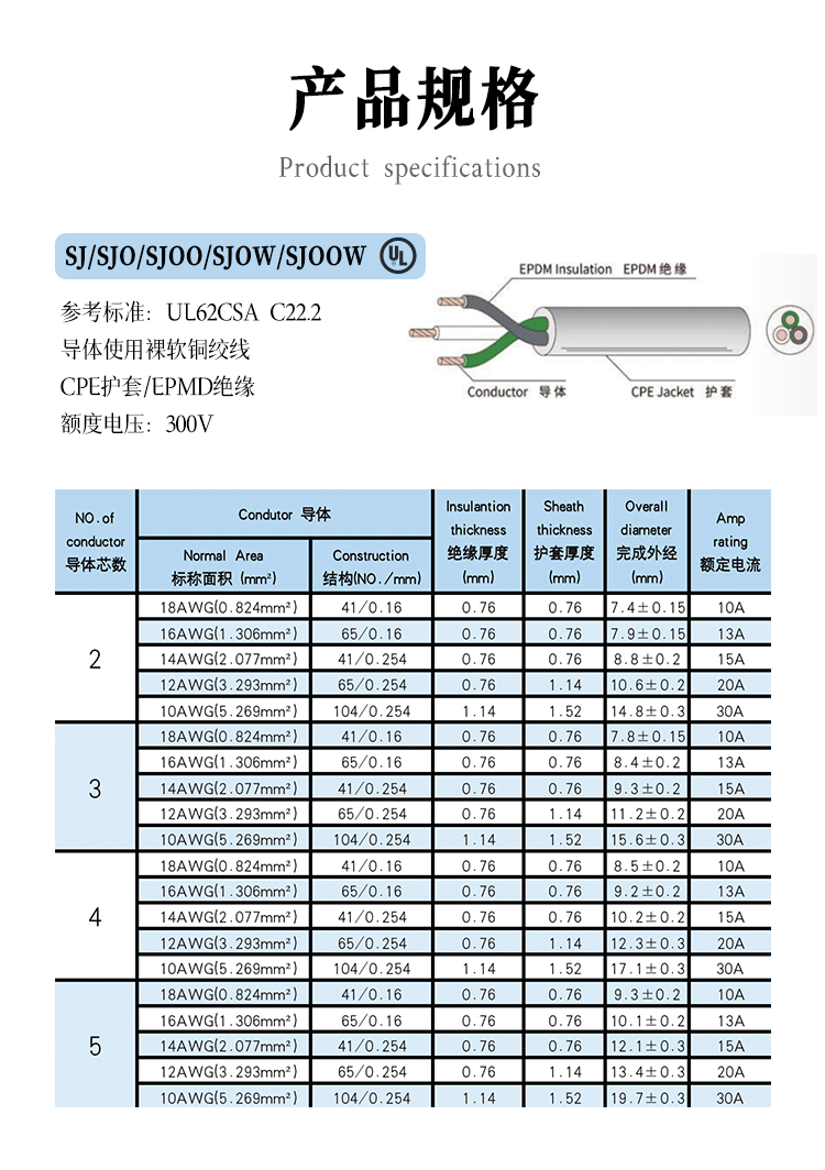 美规橡胶线低压300V系列 SJ/SJO/SJOW/SJOO