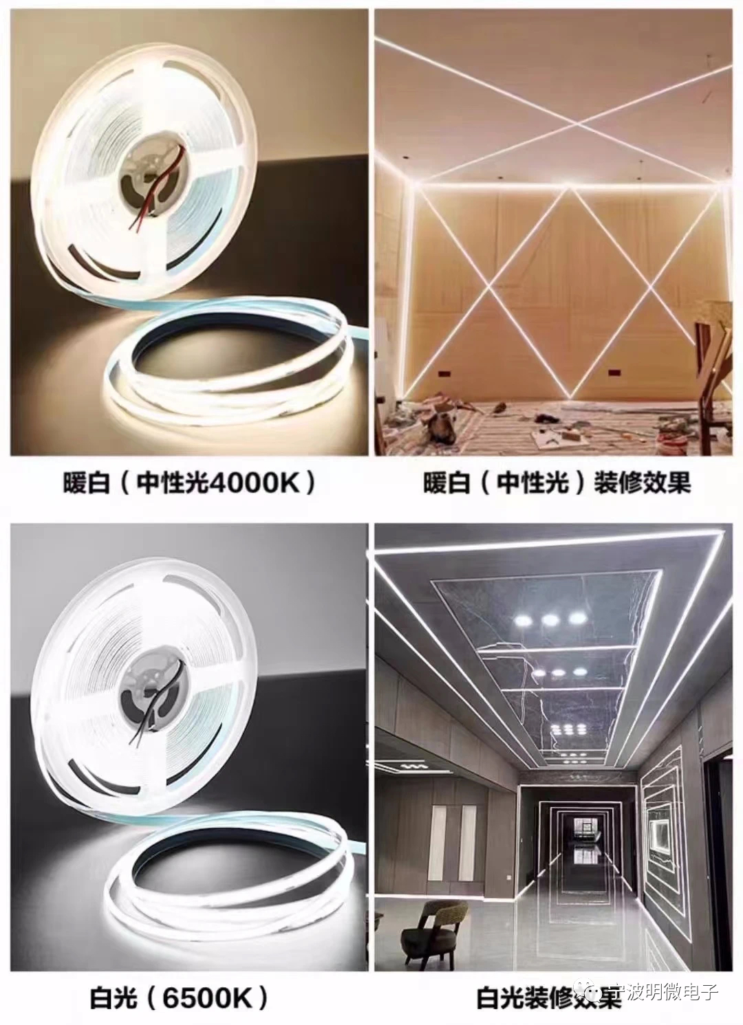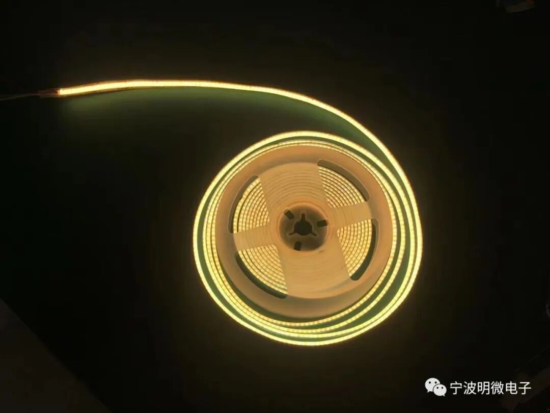 是Chip on Board英文的简写,意指板上芯片封装技术,可简单理解为:多颗LED芯片集成封装在同一基板上的发光体。 就是将芯片封装在软板上的灯带,然后在芯片表面直接滴一层混合有荧光粉的封装胶水,经过烘烤包装COB灯带就成型了。 COB灯带作为一款新型的高亮度高显指的线性照明灯带,其外观精美,光线柔和均匀,无光斑,采用倒装封装工艺,散热性好,灯带的寿命更长。 COB灯带可以用在很多地方,商业照明:COB灯带的高亮度和高色彩还原度,使其在商业照明领域中得到广泛应用。它们通常用于商场、超市、展览馆、酒店、餐厅、珠宝店等地的展示照明。 家庭照明:COB灯带在家庭照明中也有广泛的应用,例如用于墙壁、天花板、橱柜、餐桌、沙发等家居装饰和照明。 舞台照明:COB灯带的高亮度和可控性使其成为了舞台照明的重要选择,特别是在音乐会、表演、婚礼等场合。汽车照明:COB灯带可以用于车灯、行车灯、内部装饰灯等,以提高汽车的安全性和美观性。其他领域:COB灯带还可以应用于工厂照明、路灯照明、医院照明等不同领域,以满足不同场景的照明需求 COB灯带的亮度非常高,一米的COB灯带可达到1450流明以上的亮度,足以满足许多大型商业和工业场所的照明需求。同时,COB灯带也具有更广泛的使用场景,可以用于家庭照明、商业照明、室内和室外照明等多种场合。 COB灯带还具有优异的色彩还原度,可以让人们看到更真实、更自然的颜色。COB灯带的色温范围也非常广,可以选择适合不同场合的色温,如暖白色(2700K-3000K)、自然白色(4000K-4500K)和冷白色(6000K-6500K)等。 此外,COB灯带还具有更好的均匀性和抗干扰性。由于其芯片密度高,光线更加均匀,不会出现“点点成线”的情况。在使用过程中,COB灯带的抗干扰性也更强,对电压、电流等因素的变化更加敏感。 高光效,精选兆驰芯片、荧光粉、胶水 散热好,低光衰,防硫化,线性均匀发光,无暗影 面对中高端市场,高显指,更显高端气质什么是COB灯带
