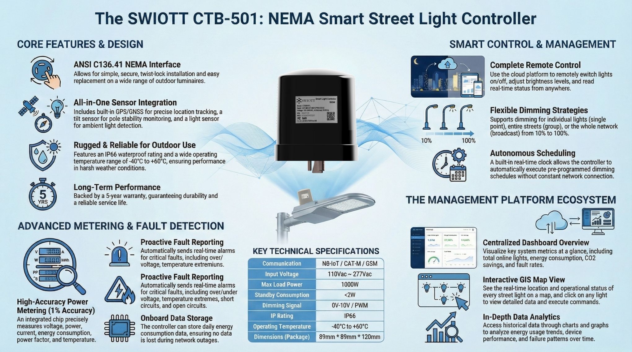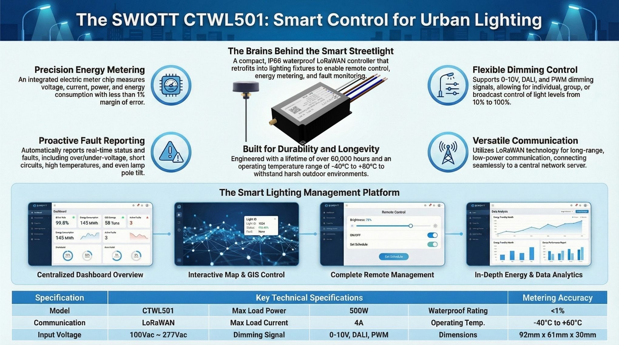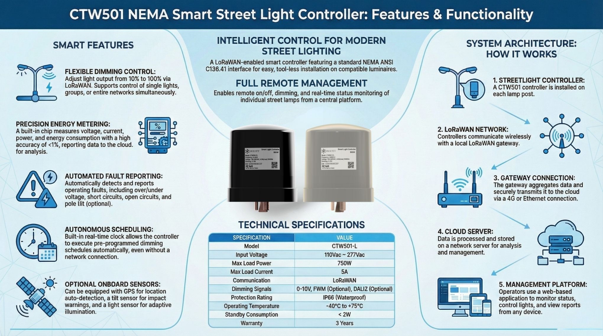 Smart Controller (CTWL501/CTB-501): Precision energy metering, proactive fault reporting, flexible dimming, and versatile LoRaWAN communication, all in a durable, weatherproof design.