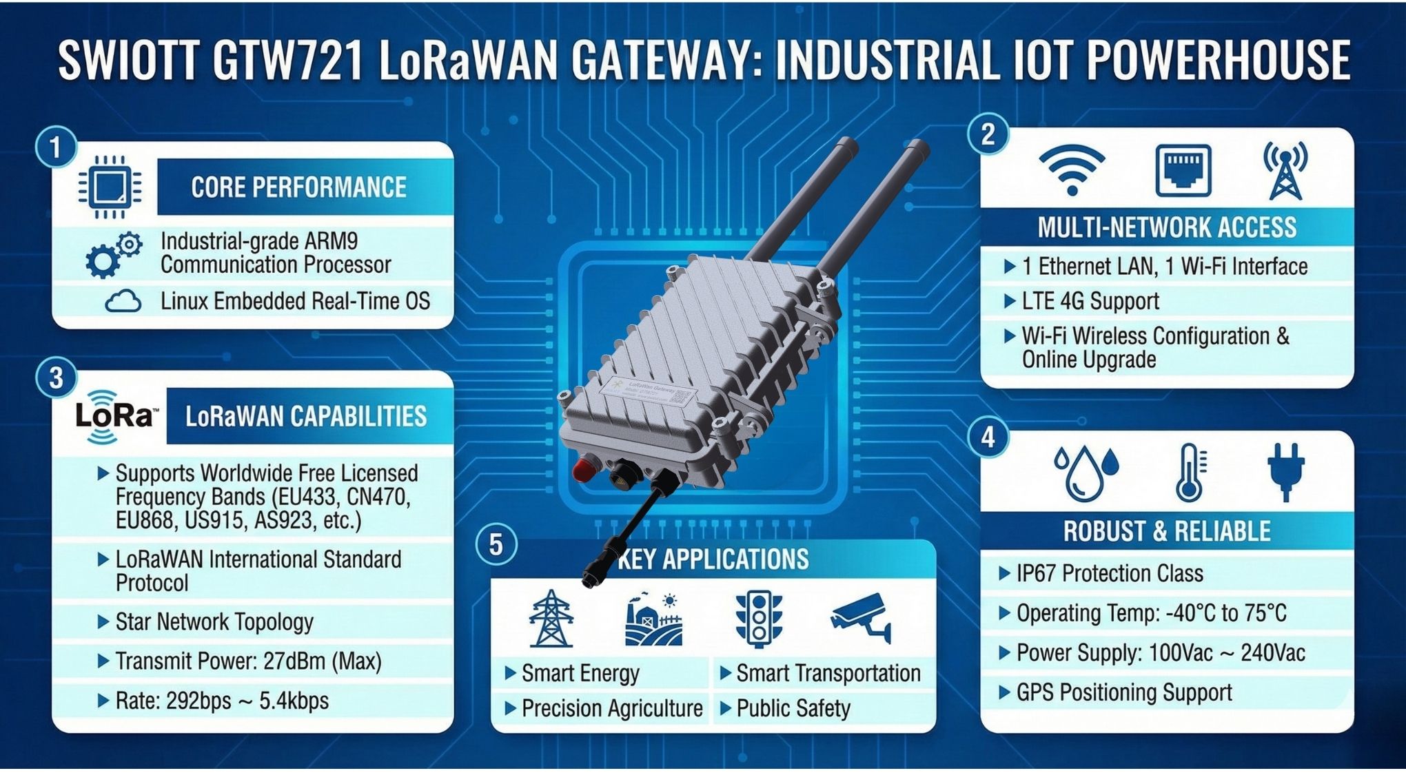 Reliable Gateway (GTW721): Industrial-grade performance with multi-network access and global LoRaWAN support, ensuring robust and reliable connectivity.