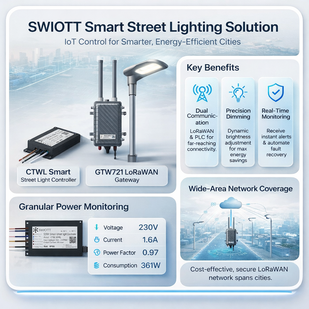 Our all-in-one system combines the CTWL controller's precision dimming capabilities with the robust communication of the LoRaWAN gateway, all integrated into a single, sleek street light unit. This integration simplifies installation, reduces hardware costs, and ensures seamless operation across your entire urban lighting network.
