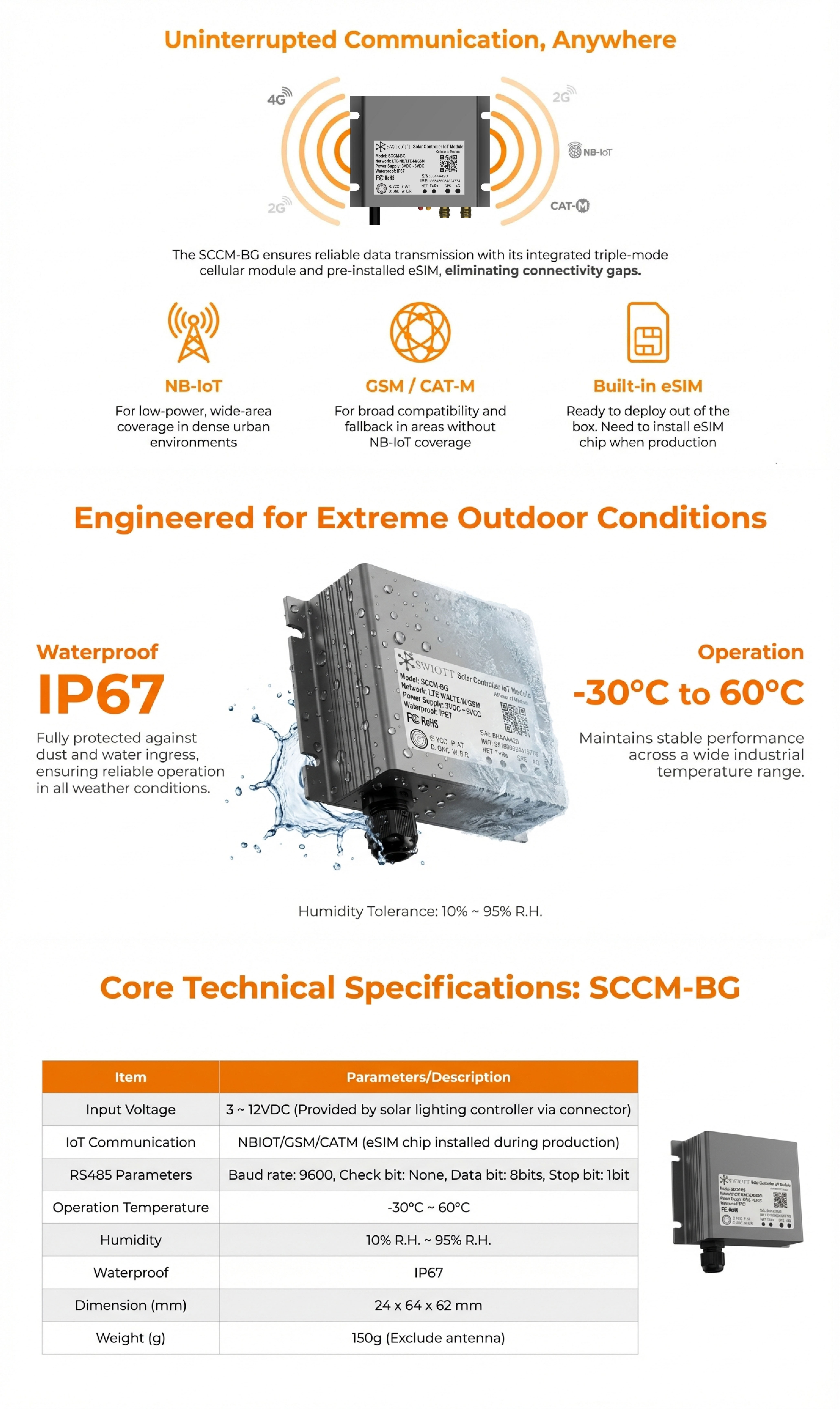 Advanced IoT Connectivity: Equipped with the SWIOTT SCCM-BG IoT Module, our system supports NB-IoT, GSM, and CAT-M communication protocols, ensuring reliable and uninterrupted data transmission. The integrated eSIM eliminates connectivity gaps, providing broad compatibility and fallback options.