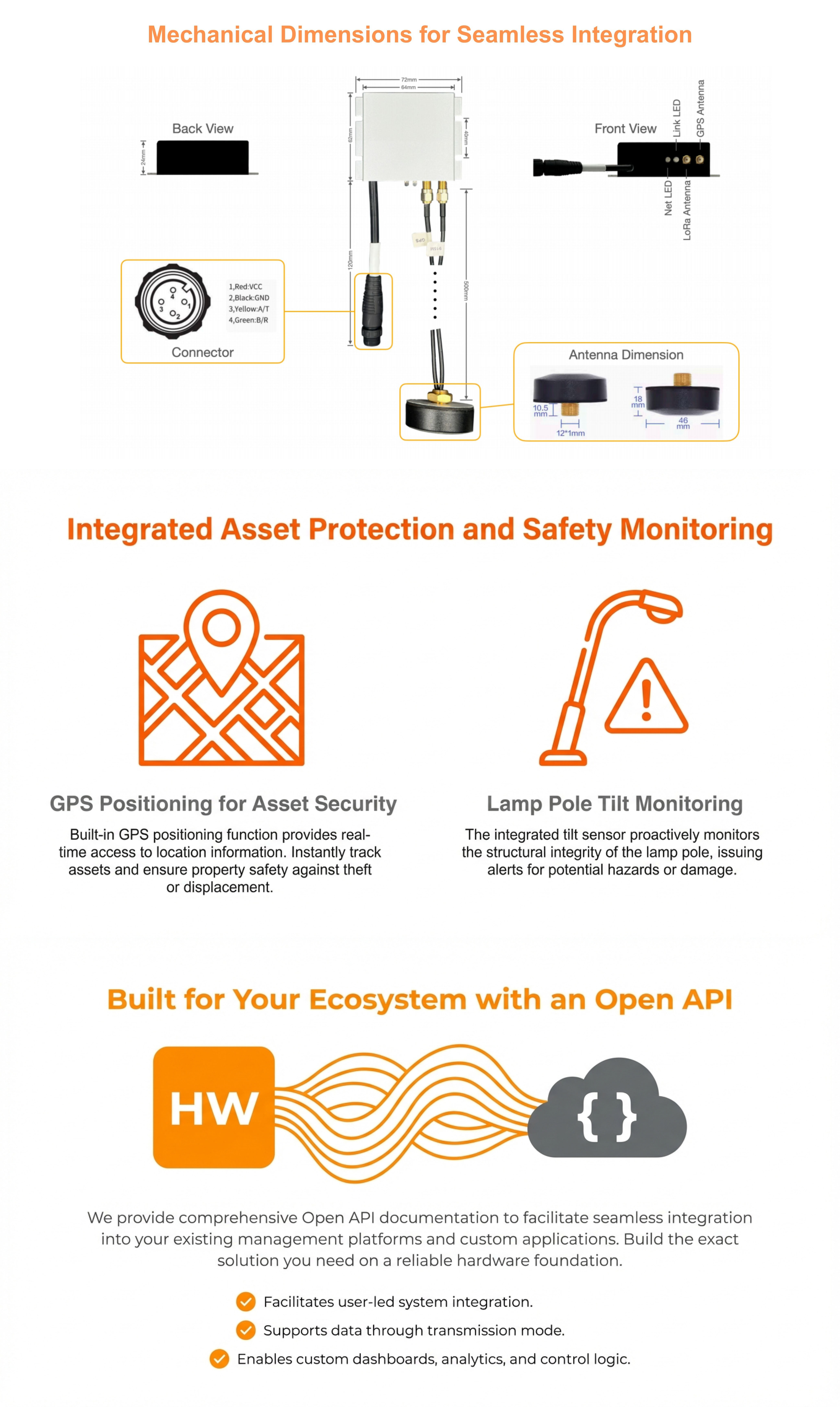 Enhanced Asset Protection: Integrated GPS positioning provides real-time location tracking, ensuring asset security against theft or displacement. The lamp pole tilt monitoring feature proactively detects structural issues, issuing alerts for potential hazards or damage.