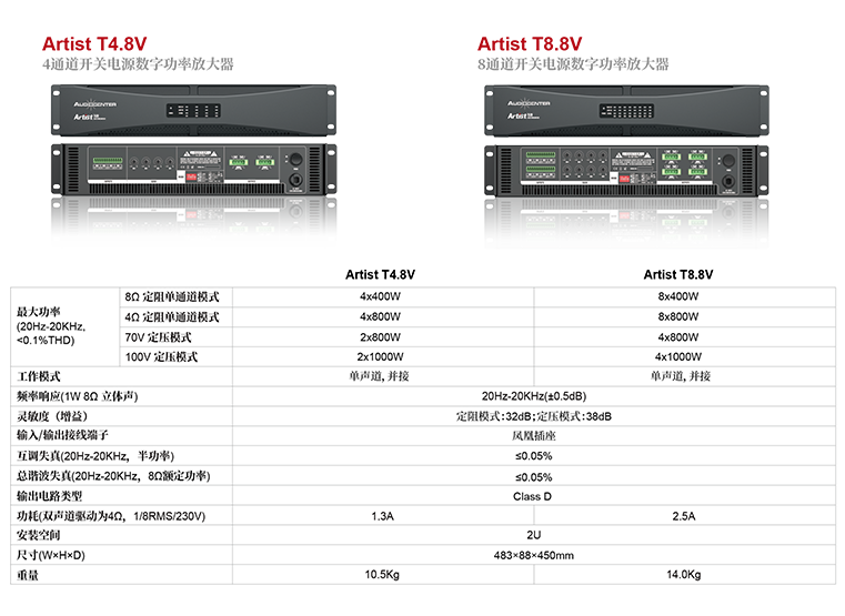 Artist T4.8V和Artist T8.8V功放采用开关电源,D类线路功放,效率高,重量轻,性能稳定。