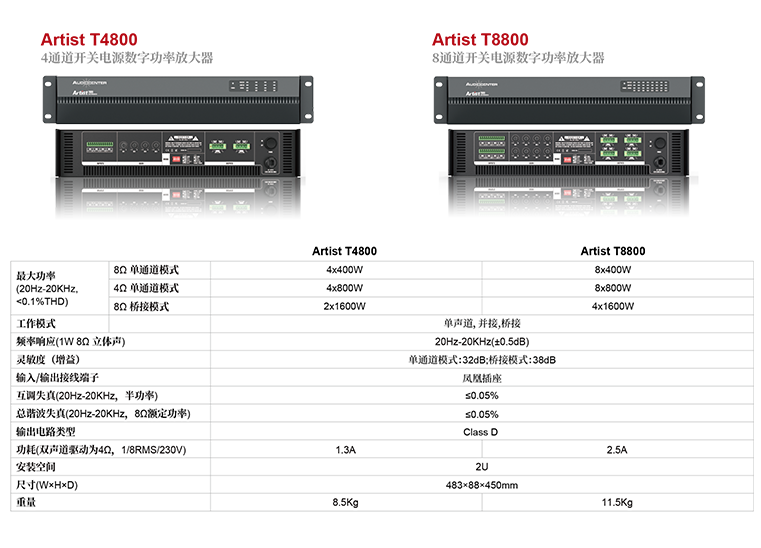 Artist T4800和Artist T8800功放采用开关电源,D类线路功放,效率高,重量轻,性能稳定。功放共有两个型号,4通道Artist T4800,8通道Artist T8800,功率输出400W(每通道@8Ω),每个声道可在4Ω负载下工作 。