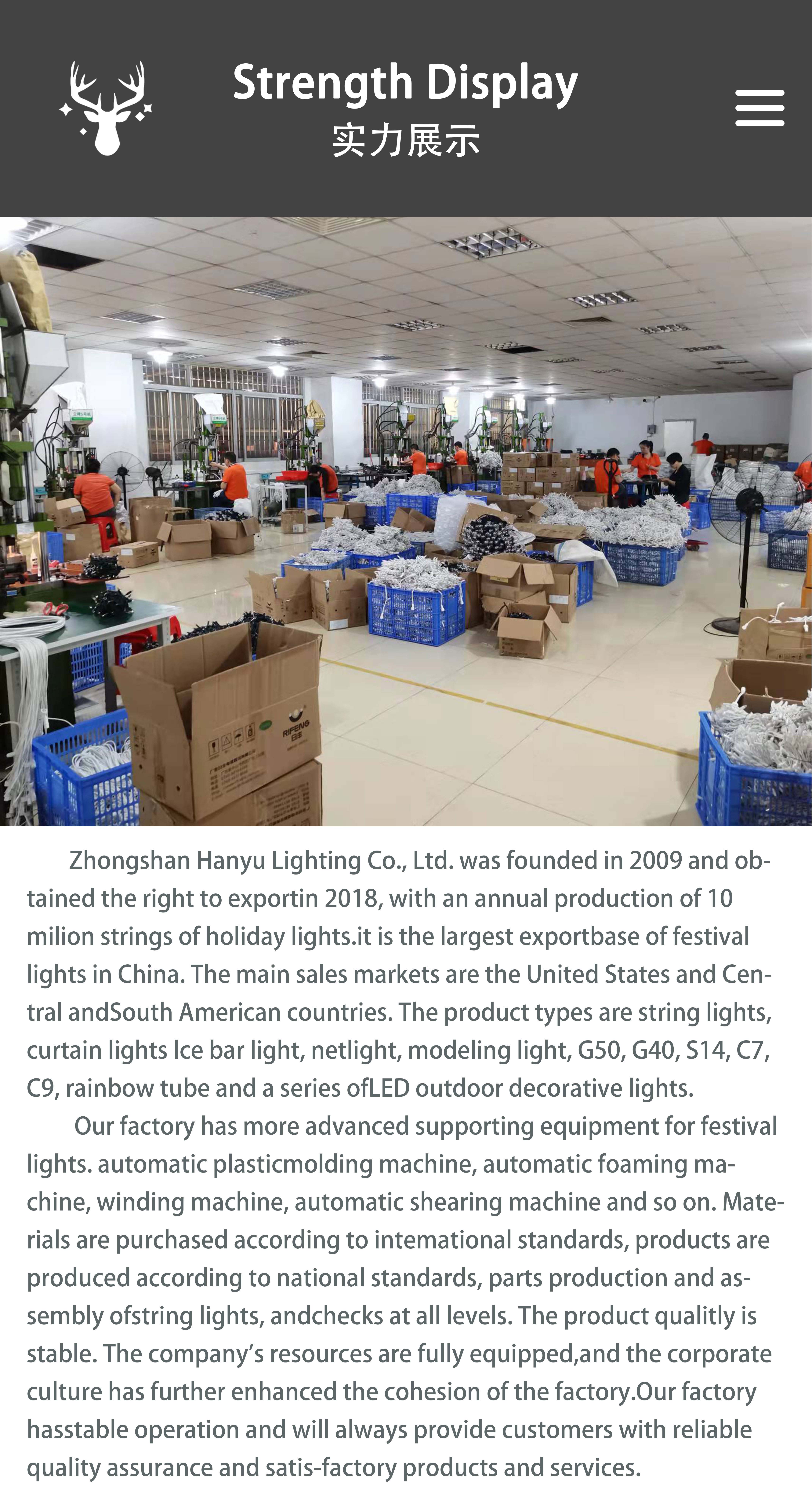 中山韩宇灯饰有限公司创建于2009年,2018年获得自营出口权,年生产节日灯1000万串,是国内较大的节日灯出口基地。产品类型有直线灯,冰条灯,网灯,循环灯,螺旋树及LED一系列的灯串。我厂拥有较先进的节日灯配套设备:电线生产设备,全自动塑料成型机,自动穿泡机,绕线机,自动剪扣机等等。材料按国际标准采购,产品按国家标准生产,零部件生产及灯串的组装,层层把关。产品量稳定。公司资源配备充分,注重企业文化建设,企业文化进一步提升了工厂的凝聚力。我厂经营稳定,会一直为客户提供可靠的质量保证及满意的产品和服务。为更好的发展业务,进一步开拓创新彩灯产品,欢迎各界朋友莅临参观、指导和业务洽谈。