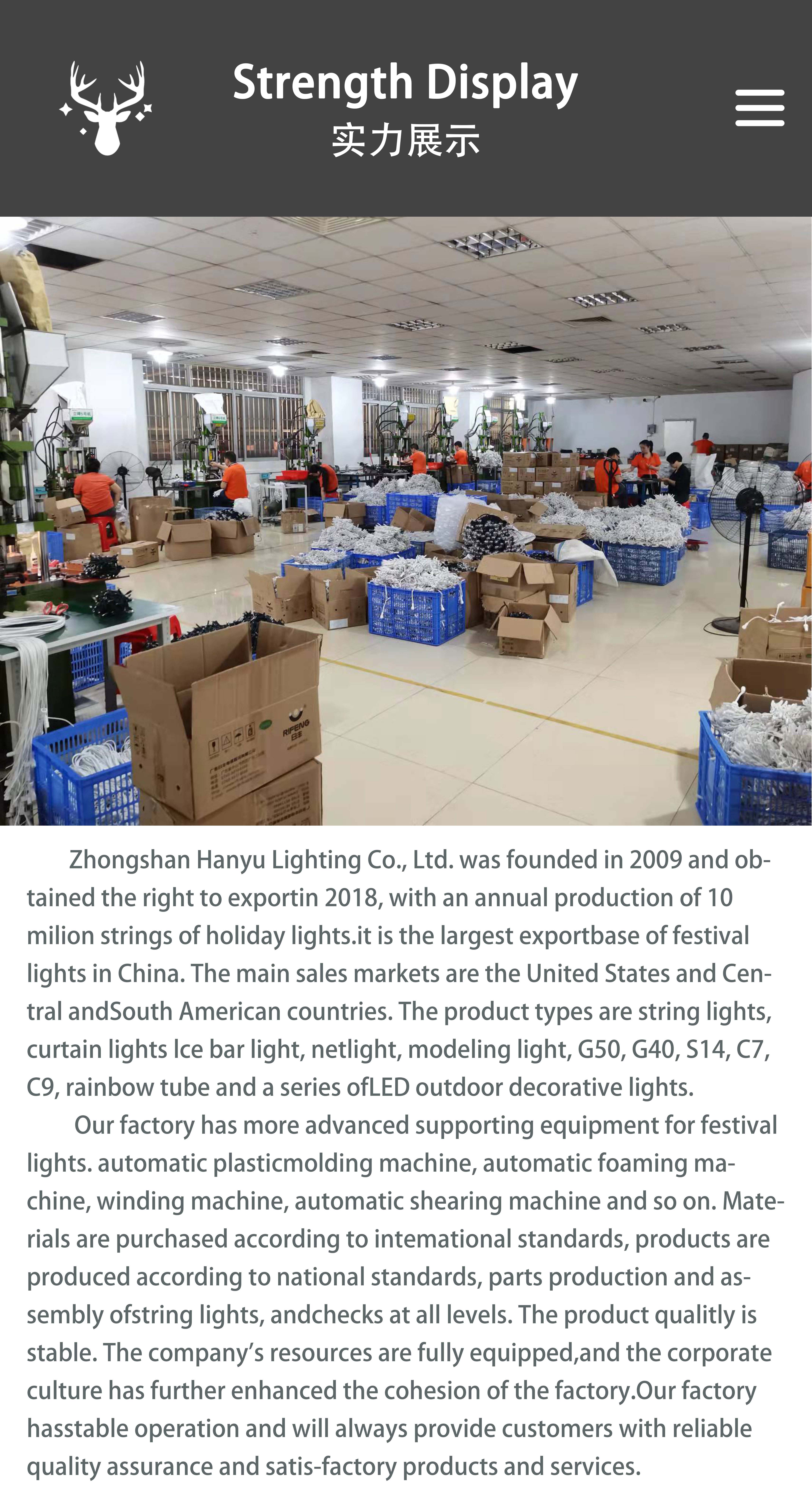 中山韩宇灯饰有限公司创建于2009年,2018年获得自营出口权,年生产节日灯1000万串,是国内较大的节日灯出口基地。产品类型有直线灯,冰条灯,网灯,循环灯,螺旋树及LED一系列的灯串。我厂拥有较先进的节日灯配套设备:电线生产设备,全自动塑料成型机,自动穿泡机,绕线机,自动剪扣机等等。材料按国际标准采购,产品按国家标准生产,零部件生产及灯串的组装,层层把关。产品量稳定。公司资源配备充分,注重企业文化建设,企业文化进一步提升了工厂的凝聚力。我厂经营稳定,会一直为客户提供可靠的质量保证及满意的产品和服务。为更好的发展业务,进一步开拓创新彩灯产品,欢迎各界朋友莅临参观、指导和业务洽谈。