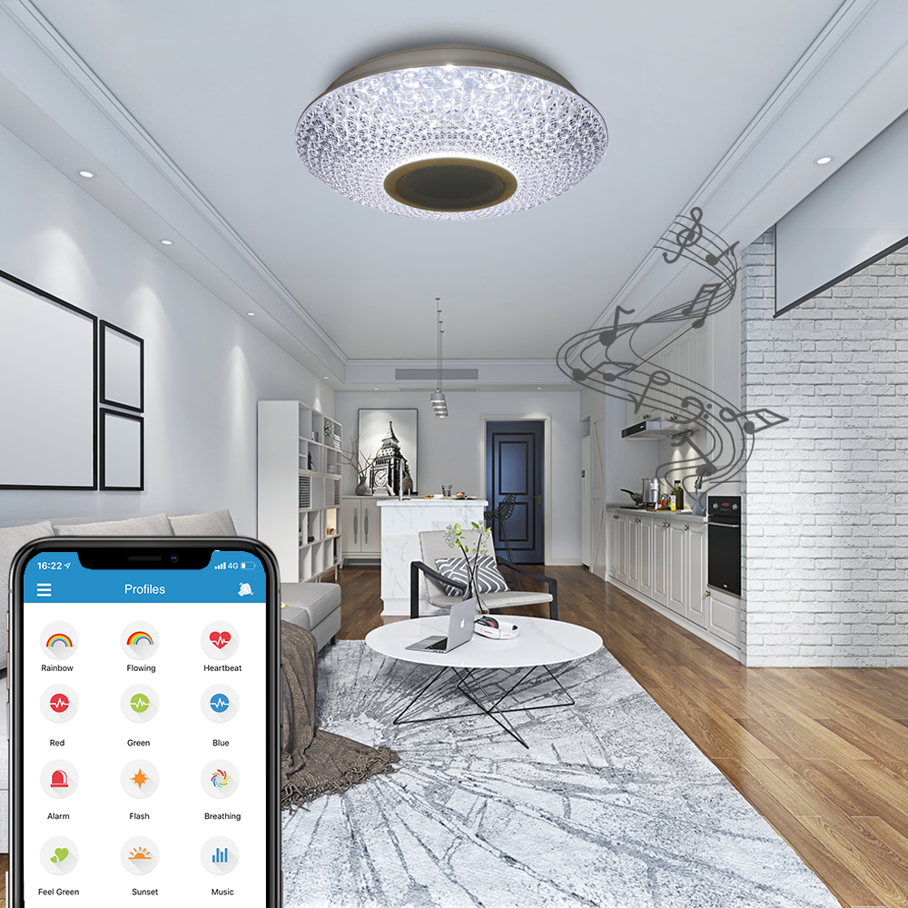 Bluetooth music ceiling lamp, smart home option! Controlled by controller and Phone APP, with multifunction, such as play music, RGB light, white light, Dimming, scene lighting, time set etc.蓝牙遥控吸顶灯,无极调光调色,Phone APP, 音乐,RGB, 定时,场景灯。