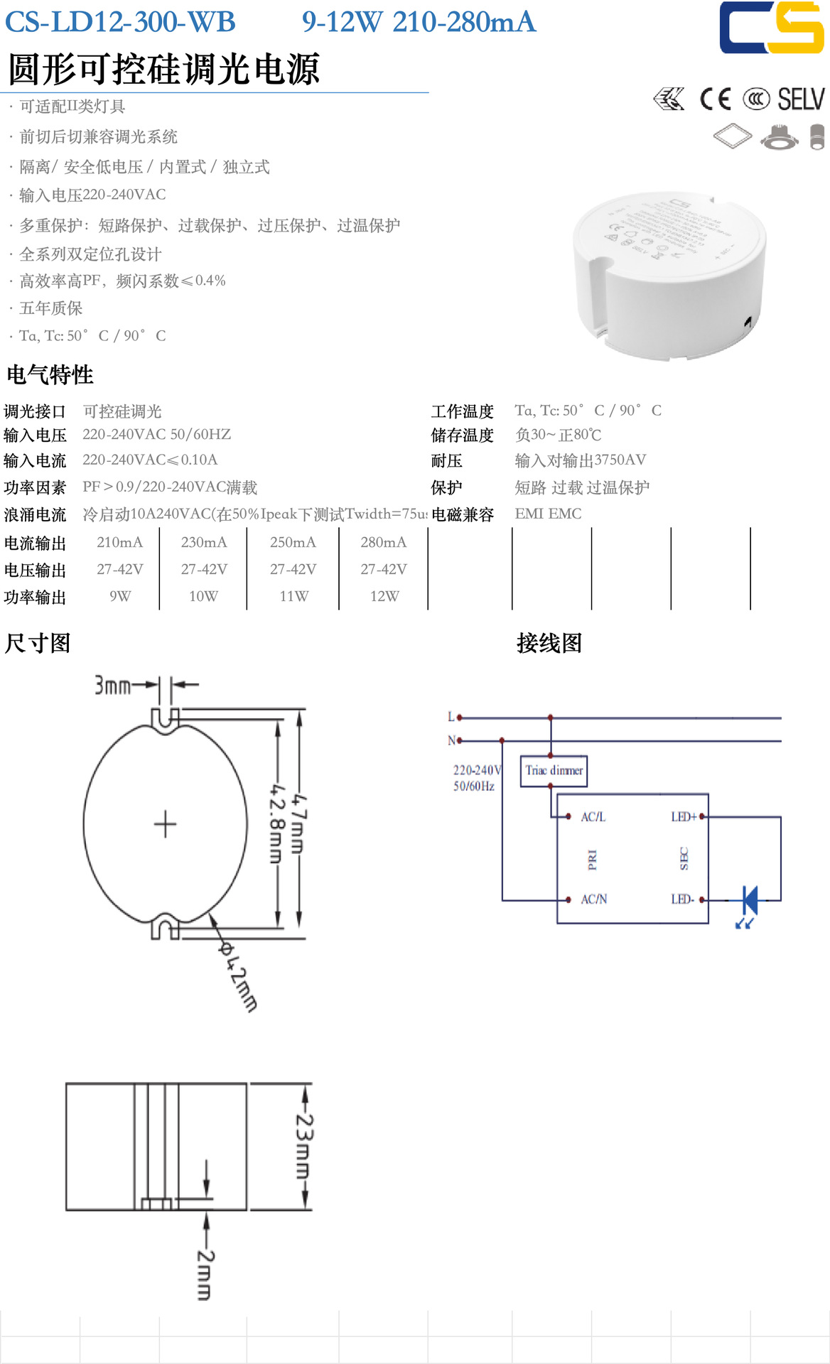 圆形可控硅调光电源CS-LD12-300-WB参考9-12W