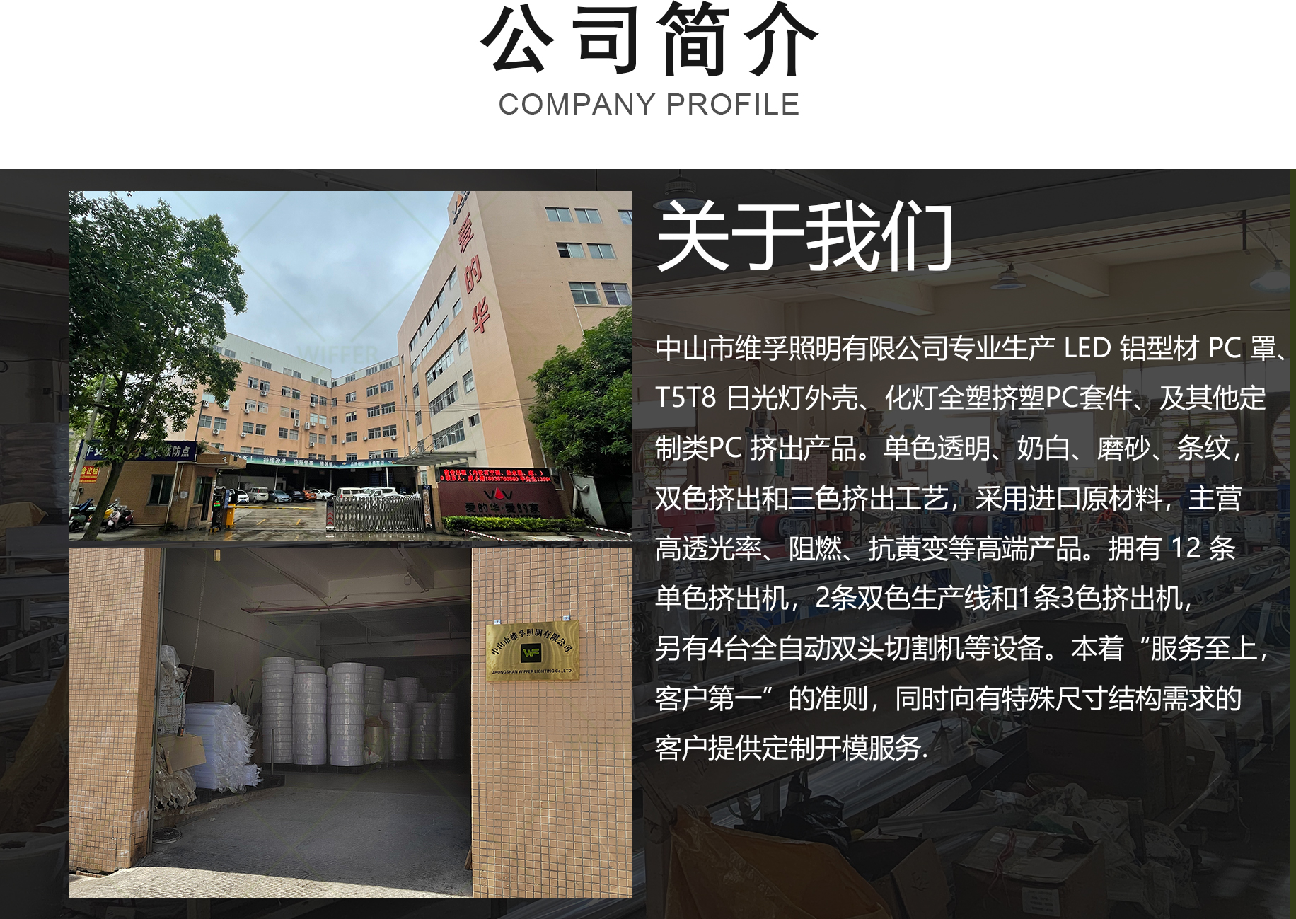 中山市维孚照明有限公司成立于2019年11月11日,位于广东省中山市横栏镇茂辉工业区,是一家从事LED照明配件与塑料挤出制品的生产厂家。主要产品涵盖:透明PC罩、PC扩散灯罩、PC磨砂灯罩、线型办公照明PC罩、LED双色压花防眩灯罩、办公吊灯防眩蜂窝罩、抗UV挤塑灯罩、铝型材PC卡边条、PC空心圆管、T5/T8塑料灯管外壳及LED三防灯全塑外壳套件等,应用于办公照明、商业照明、工业照明及工程配套领域。企业拥有单色、双色、三色挤塑设备多台,支持模具定制与异型材挤出加工,形成了集设计、挤出、检测与包装于一体的完整制造体系。企业专注PC塑料挤出工艺,提供灯罩与异型材的设计、开模与量产服务。产品结构覆盖单色、双色与三色共挤,表面处理包括扩散、磨砂、压花/棱晶、防眩、透明与瓷白等;适配线条灯、T5/T8灯管、办公吊灯、三防灯、防爆灯与植物灯等应用场景。公司具备单色、双色与三色共挤能力,可在同一型材内实现透光层与遮光层一体化成型;支持异型截面与内槽结构的定制化设计。常规定制模具周期约7–10天,量产周期约3–5天;单班(12小时)日产量视结构复杂度约2,000–4,500米。主要原料采用韩国乐天、拜尔(科思创)、帝人及中蓝国塑等PC材料,部分原料具有UL与RoHS等合规证书。生产过程执行干燥、温控与定型等工序控制,关注透光率、雾度、直度与壁厚稳定性等指标,以满足照明配件的装配与光学一致性要求。公司现有单色挤塑设备9台、双色2台、三色1台,综合月产量约50–60吨。配套设备包含定型水槽、牵引切割、混料与包装环节,形成从模具、挤出到出货的连续化生产流程。产品面向灯具制造商、贸易商与工程项目客户,销售区域涵盖中山、广州、深圳、上海、宁波、山东等地,并向海外市场供货。企业以交期与配合度为重点,提供中小批量与定制化服务。