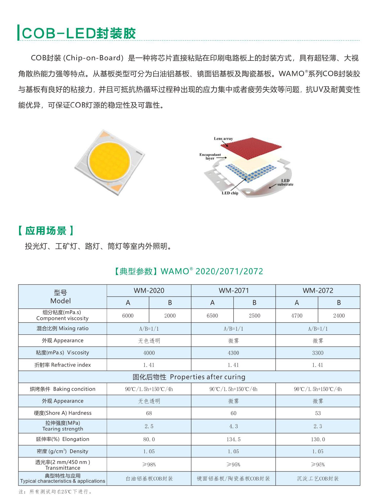 广东万木新材料科技有限公司于2010年在广东江门成立,专注于LED封装材料的研究、生产和销售,公司的产品、技术及应用为照明及显示领域提供各种优秀且有效的材料解决方案。公司深耕LED封装胶材料细分领域行业13年,是专业研发和制造半导体封装材料的高新技术企业,属半导体与集成电路产业集群。主营产品LED封装硅胶材料,包括了高折苯基封装胶、低折甲基封装胶等系列,产品布局全面,主要服务于 LED 照明及显示领域。 公司已通过ISO质量管理体系和环境管理体系认证,研发、生产、销售、设备运行、办公过程已实现数字化、智能化管理和自动化生产。公司业务范围涵盖全国,是著名企业木林森、三雄极光的主要供应商,国内市场占有率约30%,产品为PHILIPS、LG 等国际品牌的间接供应商,产品成功替代美国道康宁,日本信越等国际品牌,自主品牌“WAMO”已跻身LED封装材料制造业龙头企业之一。
