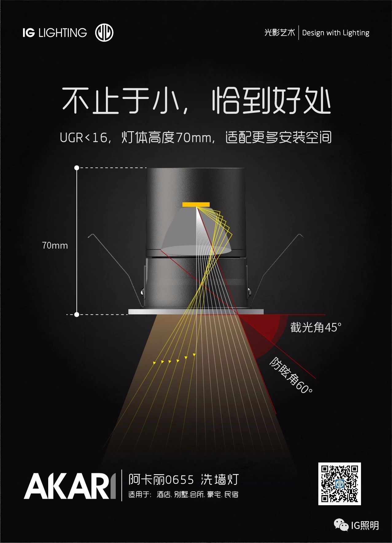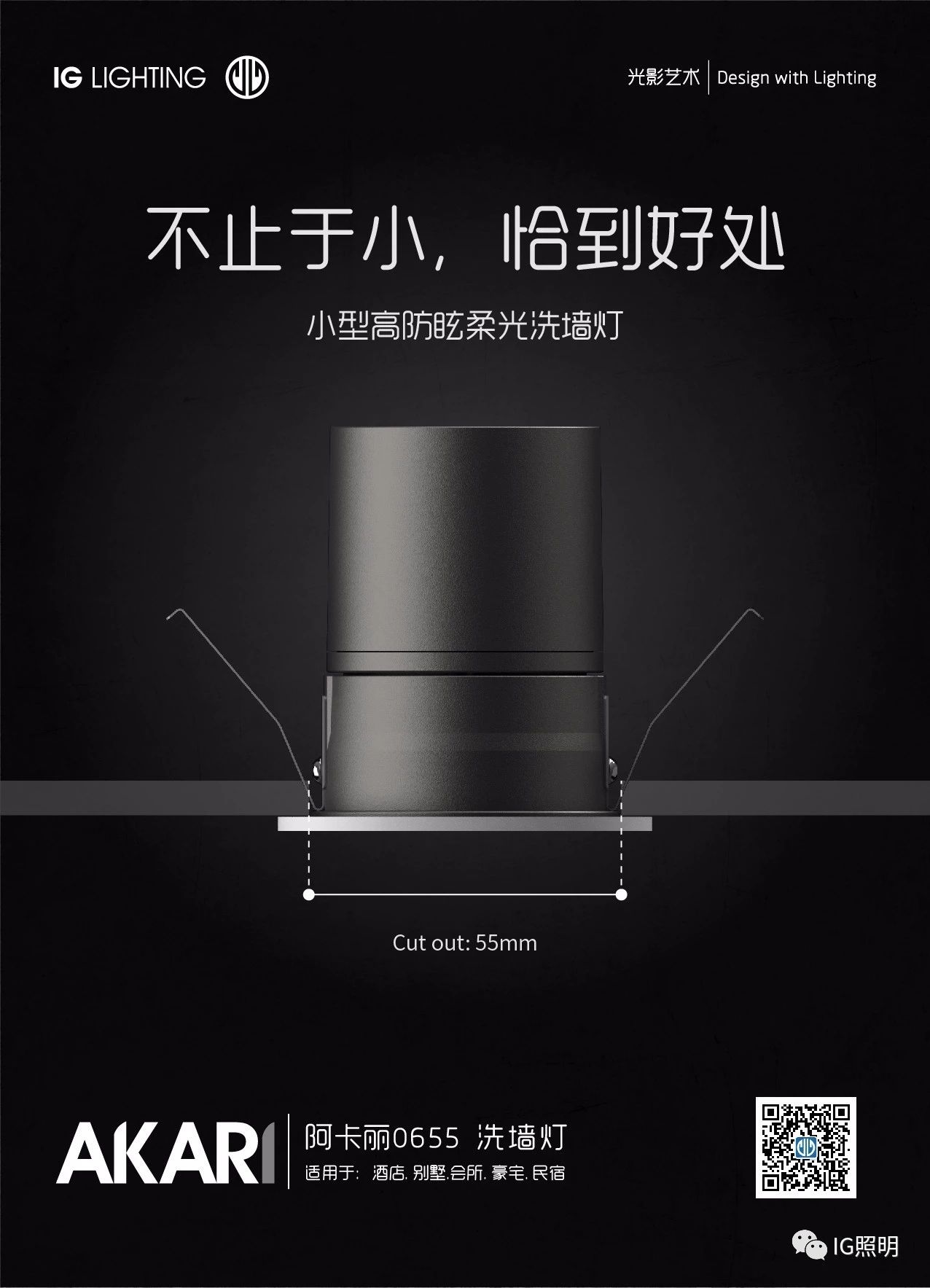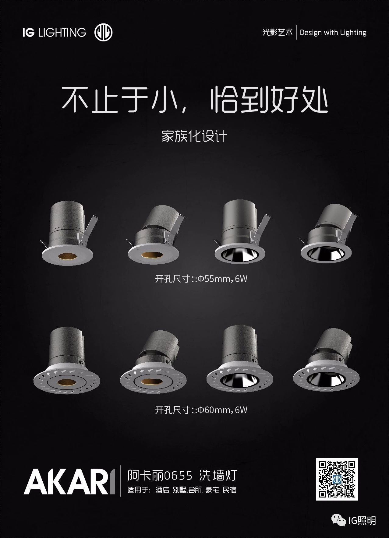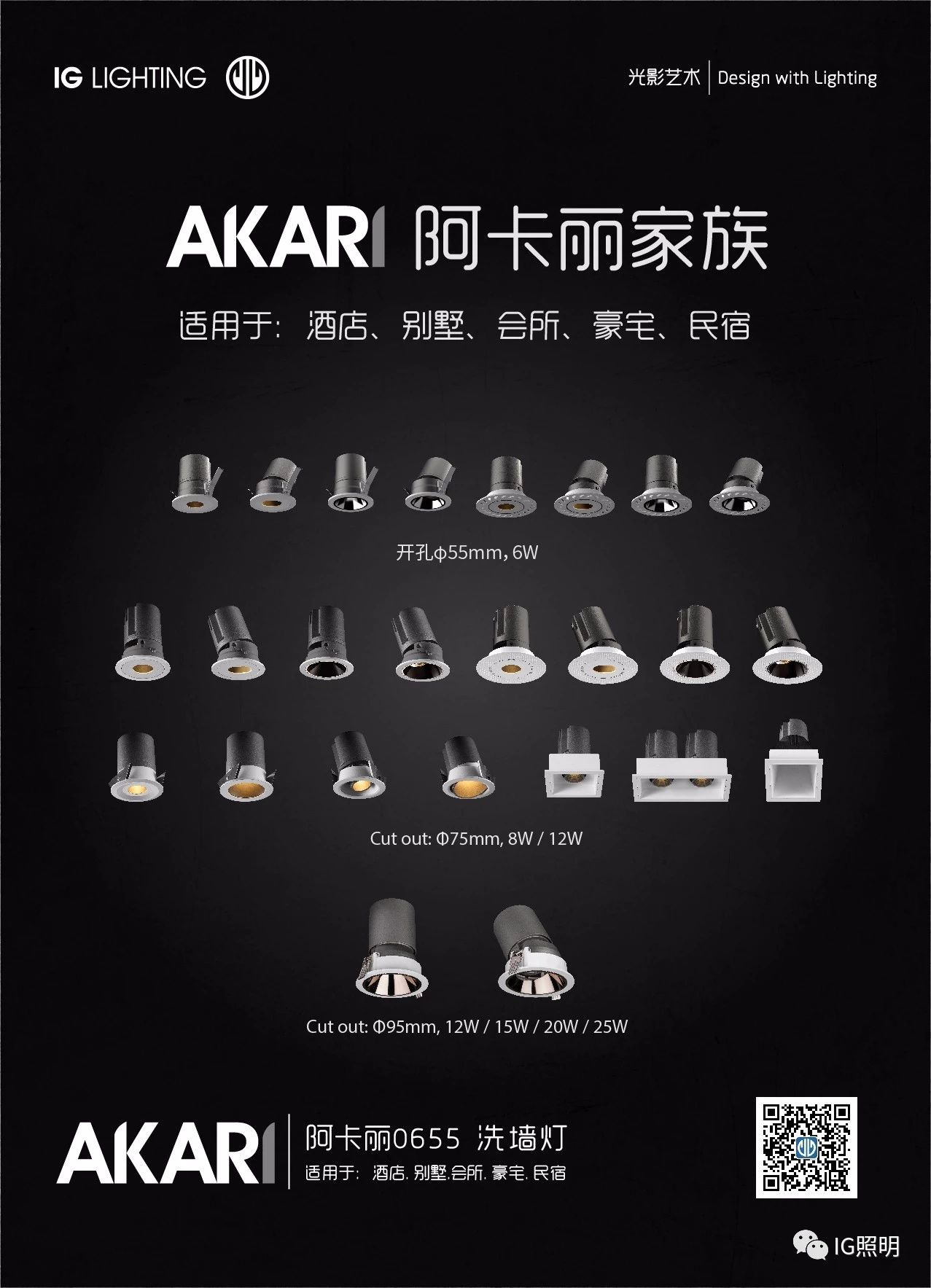 AKARI-阿卡丽家族,从55mm开孔到95mm开孔,从6W到25W,各种安装结构,光学配件,全面满足你不同的需求。