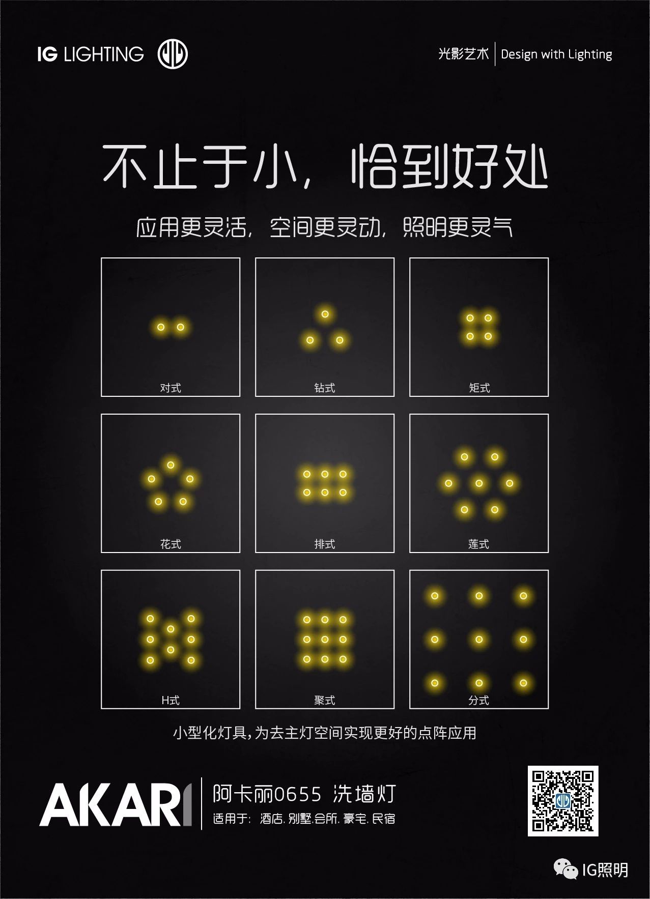 在实际应用中,小型洗墙灯使照明设计更加灵活,多种点阵应用方式,由点、线、面组成不同的灯光氛围,为去主灯空间实现更好的点阵应用。