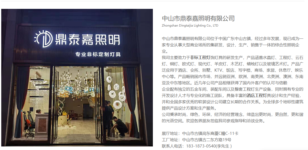 中山市鼎泰嘉照明有限公司位于中国广东中山古镇,经过多年发展,现已成为一家专业从事大型商业场所的集研发、设计、生产、销售于一体的综合性照明企业。 我司主要致力于非标工程灯饰灯具的研发生产,产品涵盖水晶灯、工程灯、云石灯、铜灯、欧式灯、现代灯、羊皮灯、木艺灯、蜡烛灯以及玻璃艺术灯。产品广泛应用于酒店、会所、别墅、KTV、饭店、写字楼、商场、家居、休息厅、娱乐中心等。产品畅销国内市场,并远销亚洲、欧洲、南美洲、北美洲、澳洲、东南亚及中东等地区。近几年公司产品相继获得了国内外客户的认可与信赖 企业配有独立的五金车间、装配车间以及整套工程灯生产设备,同时拥有专业的开发设计人才与专业化的施工团队,具备丰富的酒店工程灯具设计和生产经验,并和全国多家优秀的软装设计公司建立长期的合作关系。为全球多个地标性建筑提供产品设计方案和生产服务。 公司秉承时尚,绿色,环保,经济的经营理念,缔造出更时尚,更自然,更和谐的光语空间。欢迎各界朋友莅临我司参观指导和洽谈业务。