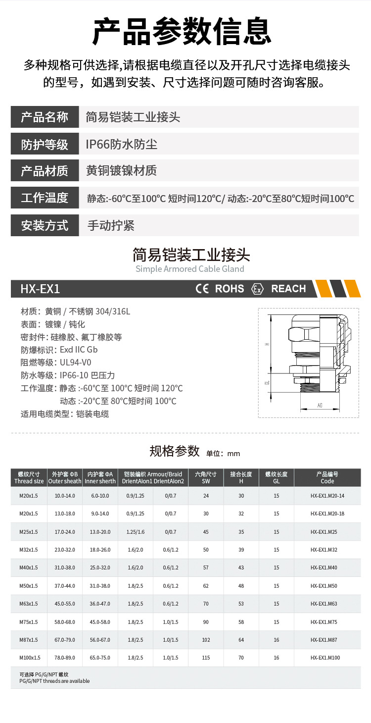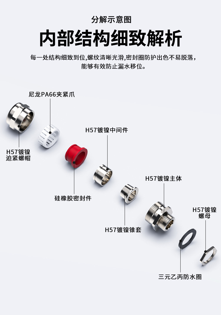 鸿祥 定制EX-1黄铜镀镍金属简易铠装格兰头防水接头