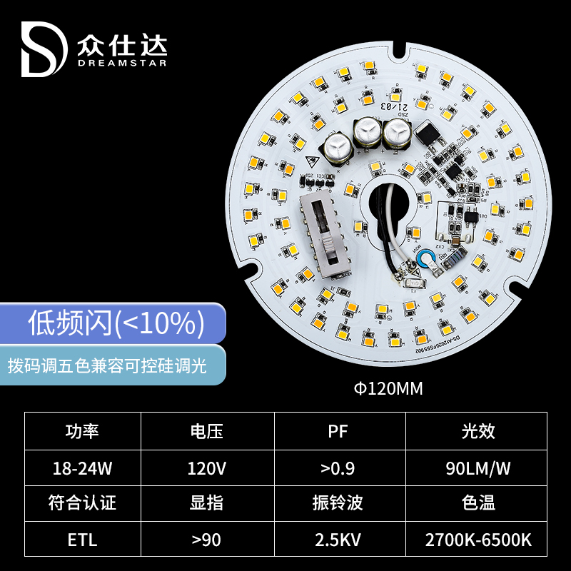 开关调色,低频闪(<10%),18-24W,直径100MM,其他尺寸可定制,