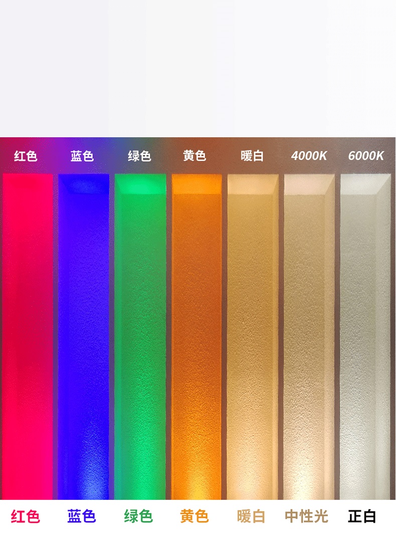• 发光颜色 正白、暖白、红、黄、蓝、绿、七彩、单色、红绿蓝(RGB)、红绿蓝白(RGBW)
