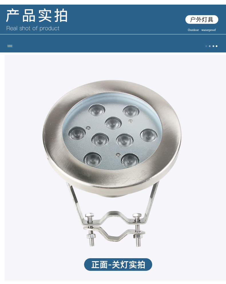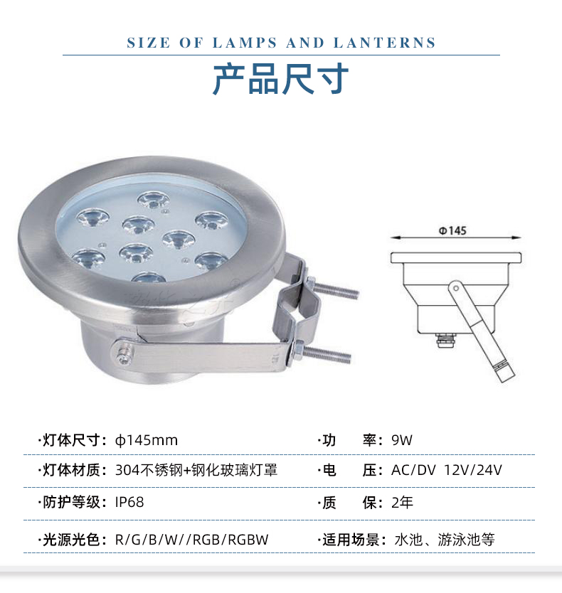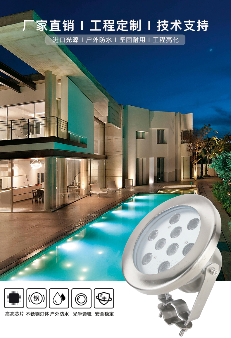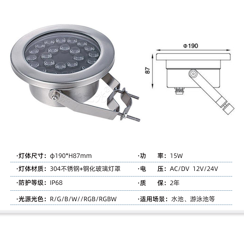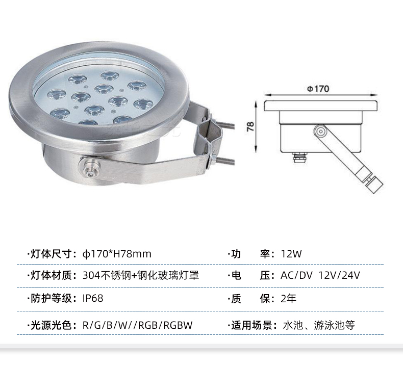 璨华led水底灯不锈钢水池射灯9w12w七彩RGB泳池灯