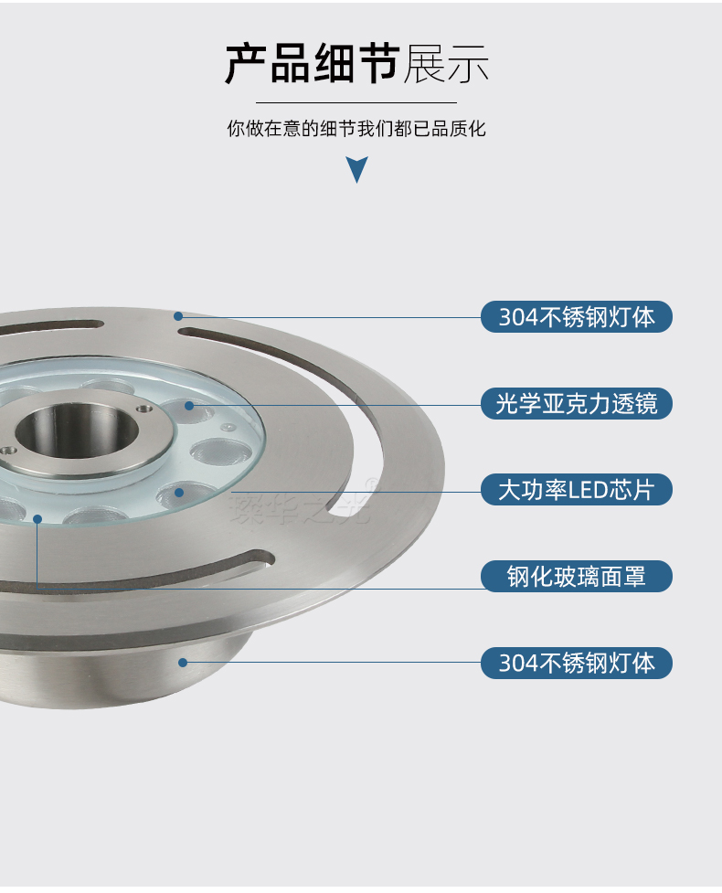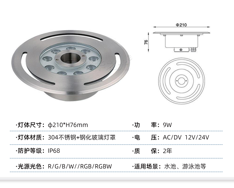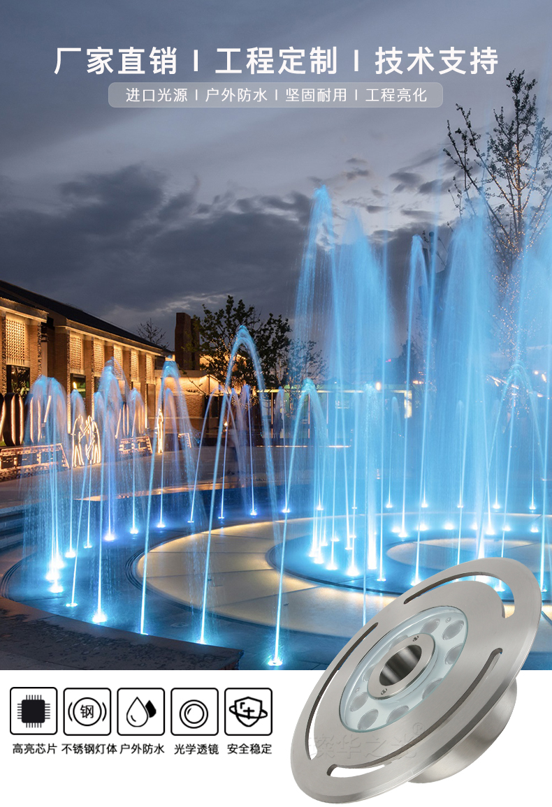 璨华LED喷泉灯不锈钢RGB七彩中孔水下泳池涌泉灯