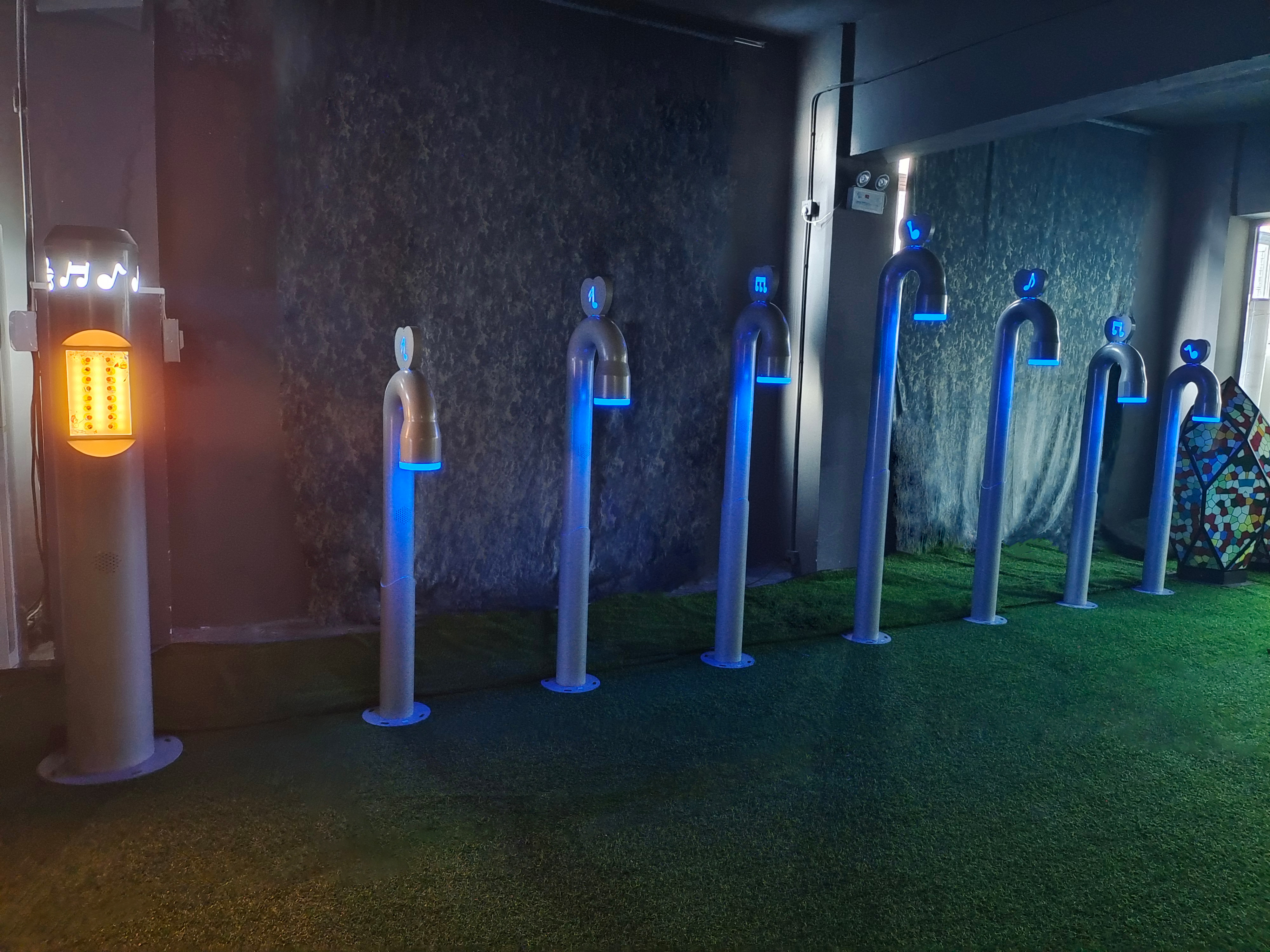 该装置由7根类似水龙头的圆形管组成,将智能互动系统将音乐与乐器组织起来。