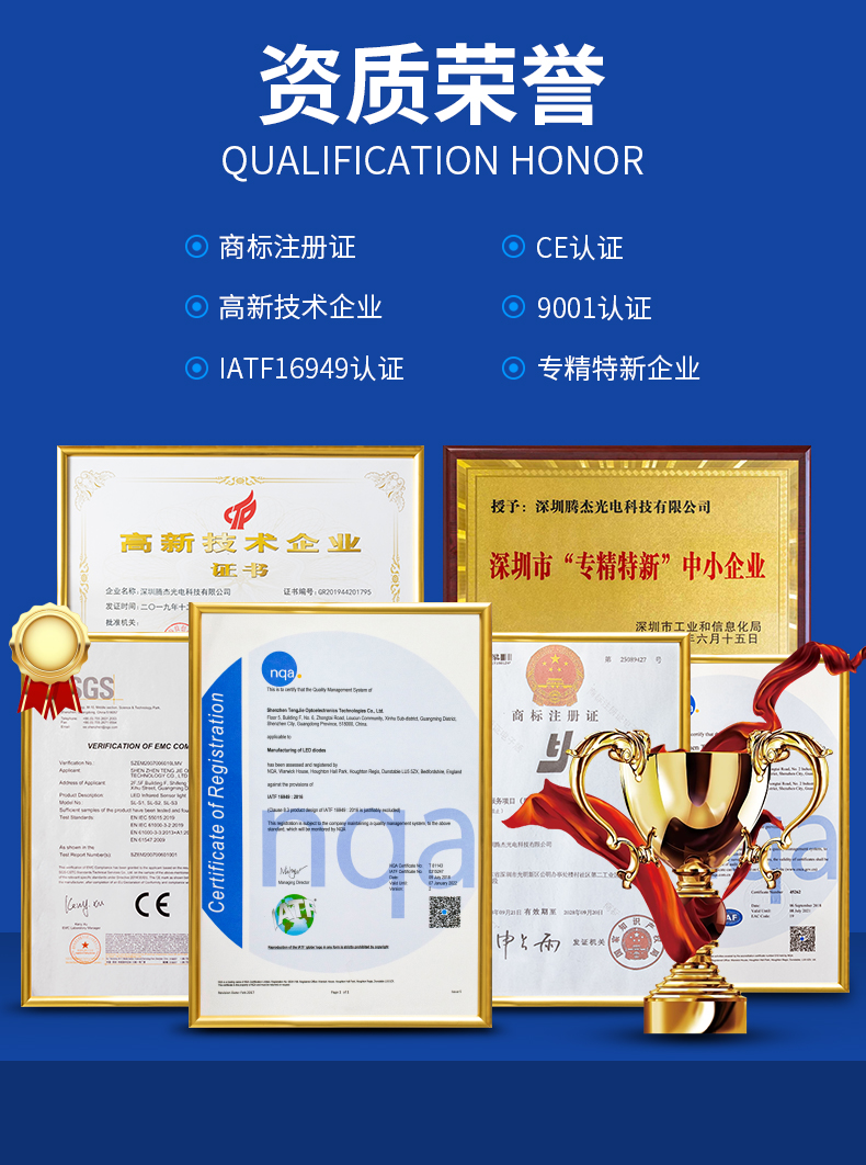深圳腾杰光电科技有限公司成立于2009年,位于深圳市高新产业区光明,万级无尘车间3300平米,员工100余名,致力专注于LED车规照明元器件和医疗传感器等解决方案的生产厂家。公司荣获国家高新技术和专精特新企业。公司主要生产LED食人鱼,贴片,插件,大功率灯珠,医疗传感器等产品,使用于汽车照明、户外亮化、医疗、安防等行业,产品遍布全球,公司授权海外代理8家。拥有自主研发微集成芯片博士10余人团队和资深的LED元器件研发生产团队15人,全自动化封装生产老化设备200余台,包括全自动固晶机、焊线机、等离子清洗机、自动封胶机、模压、自动分光编带机,实验设备13台,年产能1800KK。3天出样,7天交货,公司已通过IATF16949、ISO9001、ROHS、REACH、AEC-Q102等认证,每月进行专业技能培训,生产严格按照16949质量体系标准执行。公司目前有合作服务于五菱、陕汽、大运重卡、宇通、北汽、康泰等。