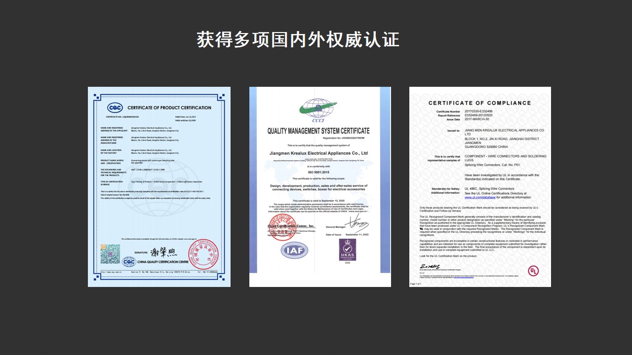 江门市创艺电器有限公司是一家集研发、生产、销售电器零配件于一身的专业制造商,资深的团队二十多年来一直专注于高端接线端子、无螺纹端子、开关等系列产品的研发和生产,总经理更受邀成为接线端子国家标准的编写委员会委员。创意电器位于江门市国家高新技术开发区,拥有建筑面积40,000多平方米的花园式厂区,配备行业领先的注塑机、高速自动冲床、智能化生产设备和精密模具加工设备,以及与产品配套的精五金生产加工、检测、试验的全部配套设施。工厂基本实现工业4.0模式生产,产品从研发到模具设计制造、零配件生产、成品组装,乃至对应的整套智能化生产设备、检测设备的研发制造均实现自我供给和无缝连接。创意电器旗下产品均通过CQC、VDE、KEMA-KEUR、UL等中国、欧盟和美国的权威安全认证。此外,公司实验室通过了中国CNAS,欧洲DEKRA和美国UL认证机构的实验室认证,推动了研发的开展和保证了产品的质量。公司拥有的100多个有效专利(其中发明专利20多个;德国、美国发明专利2个)、领先的生产模式以及稳步增长的销售使创艺电器顺利通过国家高新技术企业的认定。从创立至今,创意电器一直注重和坚持质量体系建设,是英国皇家委员会UKAS ISO9001质量体系认证的企业。公司成立了工会组织,加强了管理层和员工之间的联系。今后,创艺电器将继续秉持创新精神,携旗下品牌BELEKS创造新的业绩!欢迎广大客户与公司开展自有品牌和贴牌项目的合作,或有新产品定制需求,请与我们联系。