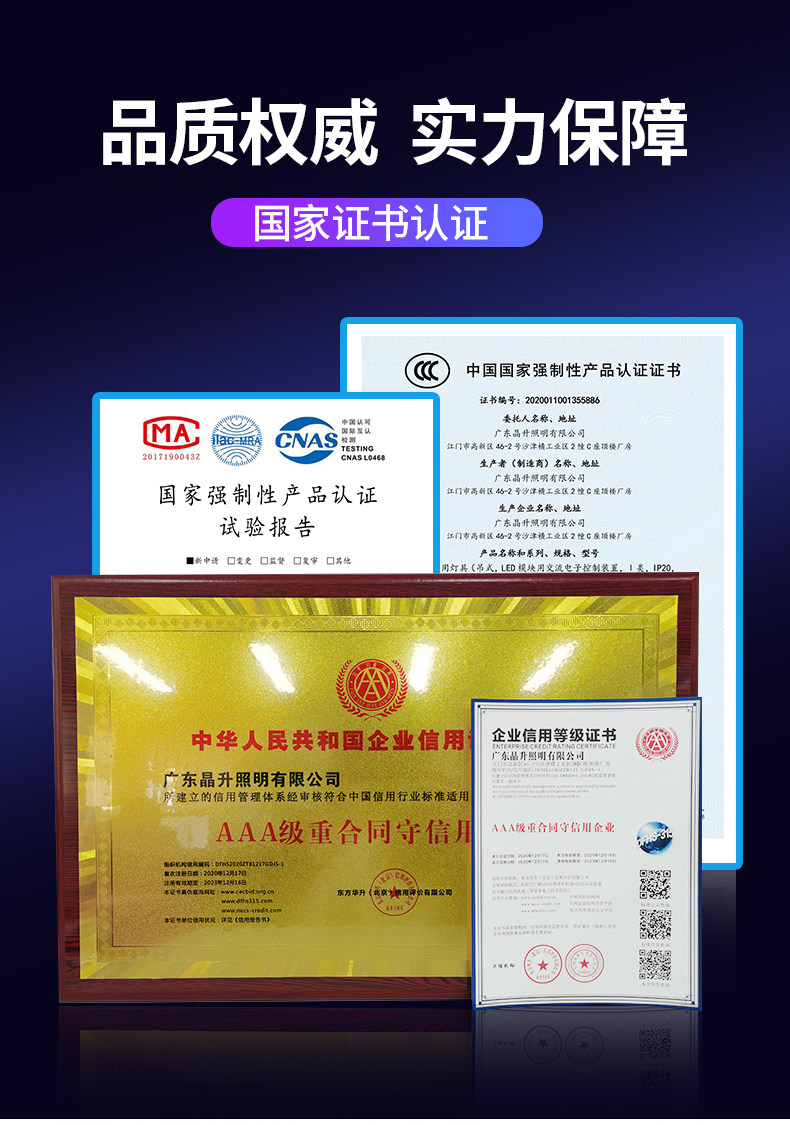 晶升照明创立于2007年江苏省常州(原名常州晶升照明)创企核心专注工业大功率照明!2007-2018年期间评为江苏省照明行业100强企业和全国照明行业500强企业。2018年公司总部迁至世界灯都中山古镇,正式定名(广东晶升照明有限公),企业重点着力于LED 工业照明设计研发生产开启面向全国乃至全球销售的复合科技型企业新篇章 晶升照明2019-2021年期间获得多项荣誉;国家高新技术企业,ISO9001认证企业3C认证企业,CE 认证企业,绿色节能认证企业,节能能效认证企业,工业照明国家重点推荐企业、国家权威检查合格产品企业、国家315诚信企业、照明行业优秀服务商企业,中国工程建设重点单位企 业,政府采购优秀供应商企业、质量信得过单位企业、AAA级诚信经营示范单位企业、AAA级重合同守信用企业、全国工程照明+强服务商企业广东省守合同重信用企业。