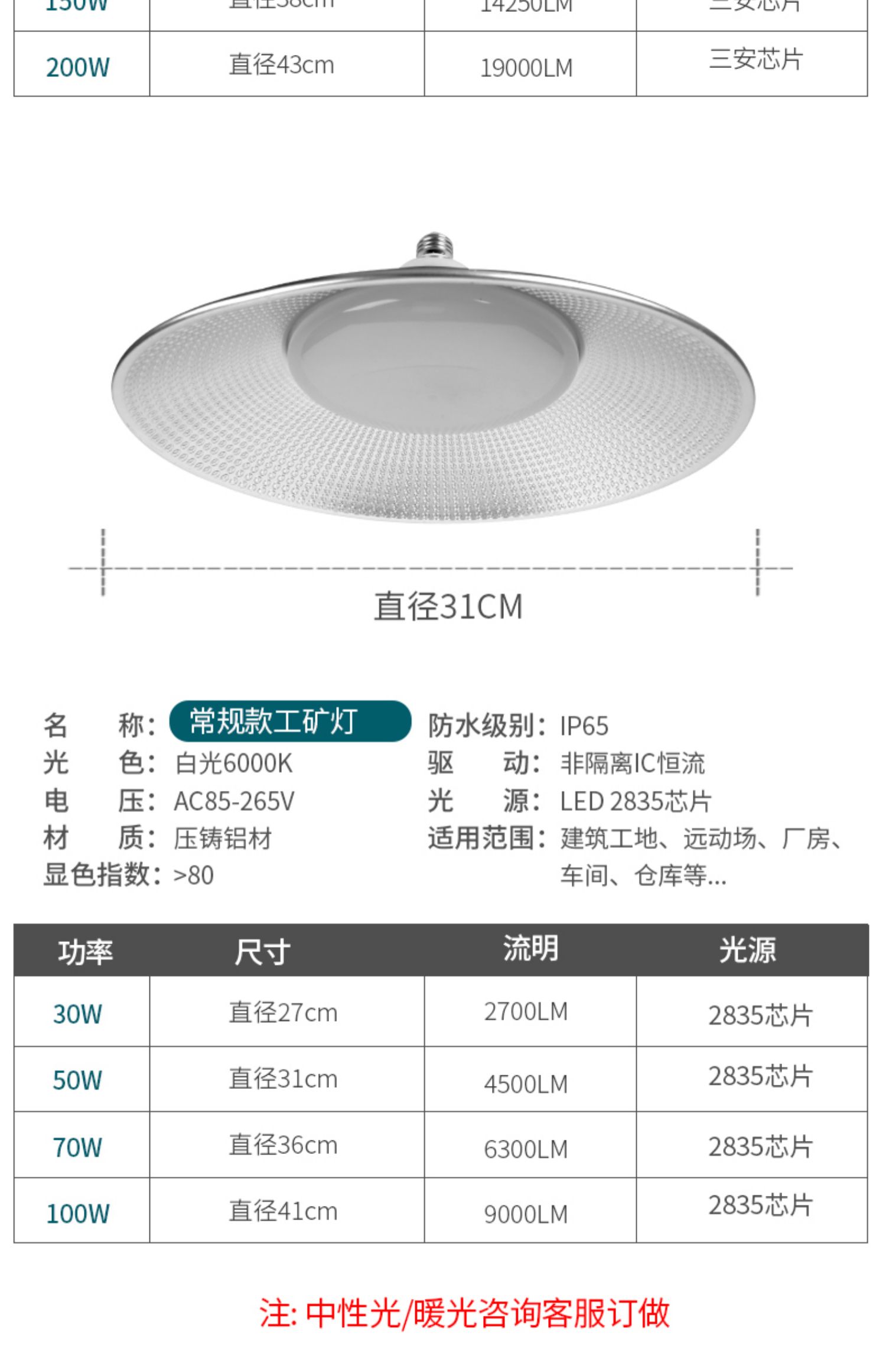 品牌:华晶升功率:100W(含)-300W(不含)颜色分类:E27螺口常规飞碟50W E27螺口常规飞碟70W E27螺口常规飞碟100W E27螺口超亮透镜50W E27螺口超亮透镜100W E27螺口超亮透镜150W E27螺口超亮透镜200W