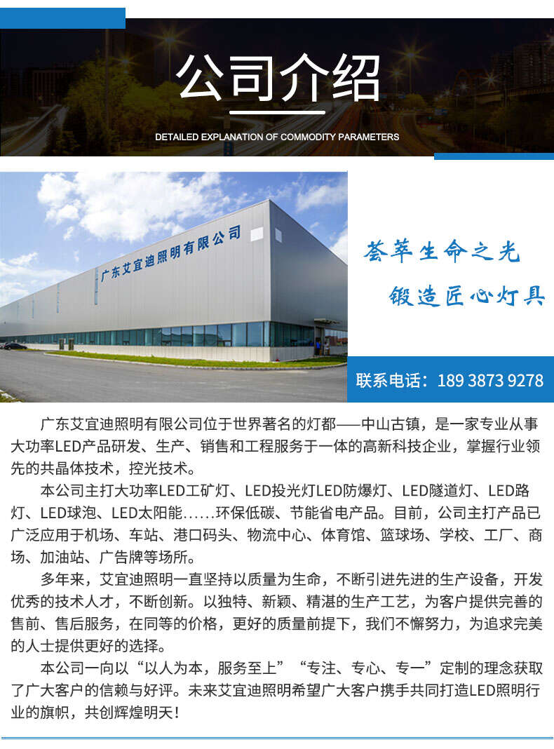 广东艾宜迪照明有限公司是一家成立于2014年,集生产、研发、销售及售后服务于一体的节能照明灯具生产企业,注册资本伍仟万元人民币,位于广东江门市,有一流的研发队伍,专注产品创新,集研发、生产、销售为一体,主要产品是LED、节能灯及相关灯具,成功入选2017中国品牌升级行动计划和入选CCTV信用中国栏目,是国家高新技术企业,获得广东著名商标,有3C认证、节能认证、CE认证、SAA认证、防爆认证。艾宜迪照明拥有完善的质量管理体系,通过了ISO9001:2008国际质量体系认证。艾宜迪照明生产的球泡灯、防爆灯、LED灯、LED灯具品质优良,自产自销模式。产品通过了CE、3C、节能、防爆等认证。产品规格齐全,功率涵盖范围广,几乎可以满足工业、商业和市政照明的全部领域。可从事合同能源管理、政府和社会资本合作项目(PPP)。