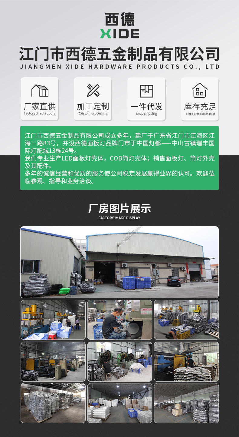江门市西德五金制品有限公司成立多年,建厂于广东省江门市江海三路83号,并设西德面板灯品牌门市于中国灯都古镇瑞丰灯配城13栋24号。 我们专业生产销售LED面板灯,筒灯壳体及其相应配件。多年的诚信经营和优质的服务使公司稳定发展赢得业界的认可。