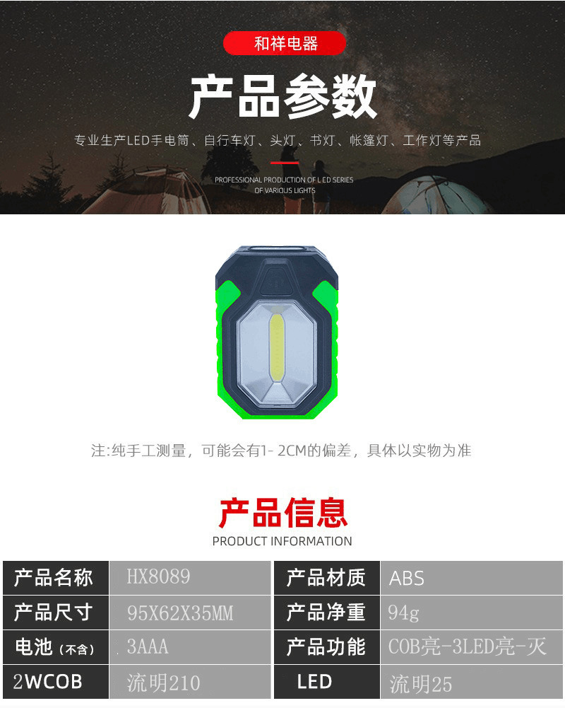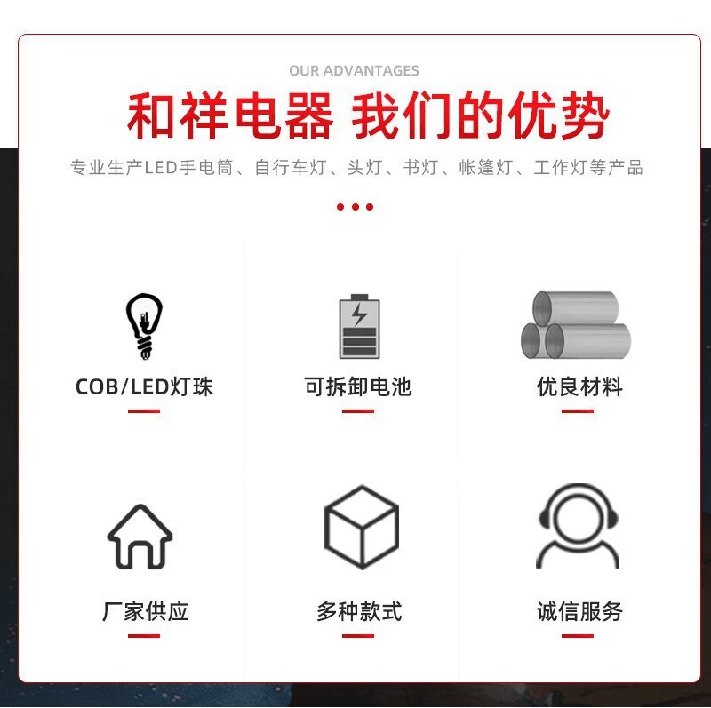 宁海和祥电器有限公司于2008年09月18日创建,公司专注于LED照明产品的研发、生产和销售为一体的综合型公司。公司坐落在浙江省宁波市宁海县西店镇香石村后溪。 主营:LED工作灯,太阳能灯,头灯,野营灯,自行车灯等一系列产品且畅销全球各地。公司拥有先进的生产、检测、研发设备,并采用优质器材。筹建了一支高素质、专业化的研发团队和行业内的人才精英确保产品质量稳定,确保出厂的每一件产品,都具备高品质性能。为了更好的服务市场,公司已通过IS9001,BSC1.产品已全面通过CE、ROHS等相关检测认证。 公司在不断发展与追求,欢迎新老客户前来治谈合作,我们将一如既往地以良好的服务竭诚为您提供优良的产品且畅销全球各地。