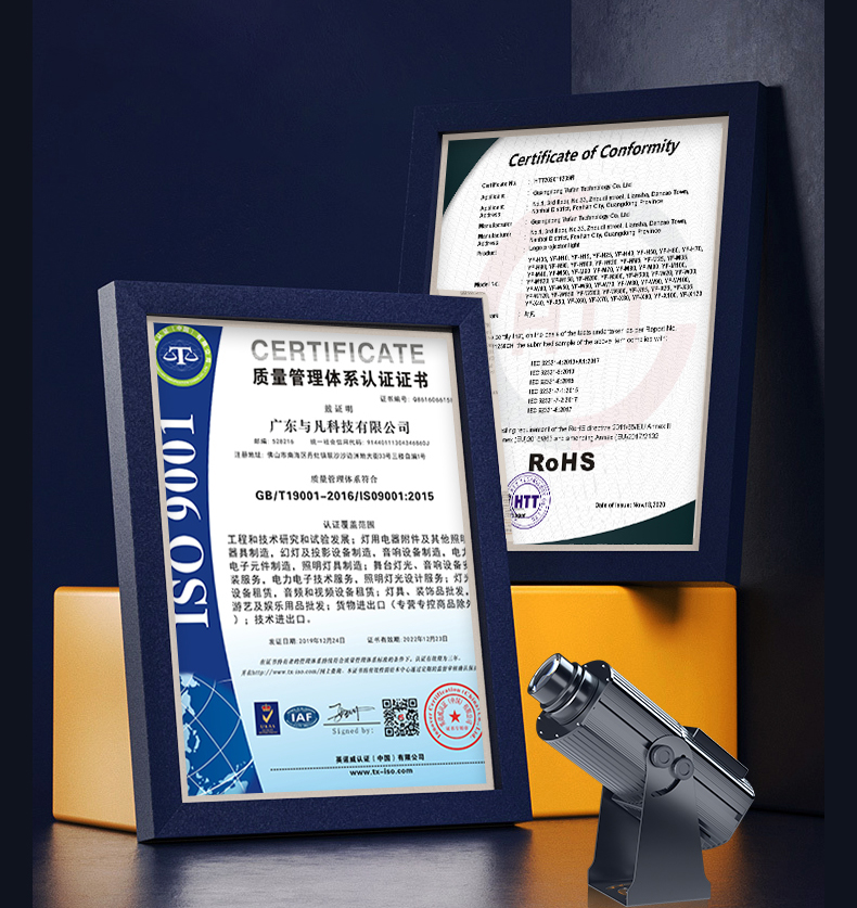 广东与凡科技有限公司,简称与凡,公司成立于2012年,注册资本500万元,生产厂房面积4000多㎡,在职员工200多人。投影灯厂家是一家集专业设计、研发、生产、销售logo投影灯、工业投影灯、水纹灯、亮化动态投影灯、萤火虫星空激光灯、互动投影、文旅亮化灯光等产品的国家高新技术企业。 公司秉承用光影技术创造社会价值,以科技创新改变用户生活的使命,与凡已成为中国投影灯行业内知名品牌,并在全国建立成熟的代理商、经销商网络。投影灯厂家的工业投影灯产品远销欧美、东南亚等国家。目前已成为业界广告投影灯产品最大的生产商。 公司旗下品牌:与凡、阐存、默奇等在天猫平台logo投影灯行业连续5年销量第一。 公司通过ISO9001质量检测体系认证,产品通过CE、ROHS、KC认证,同时通过国家CNAS、MAS质量检测认证。