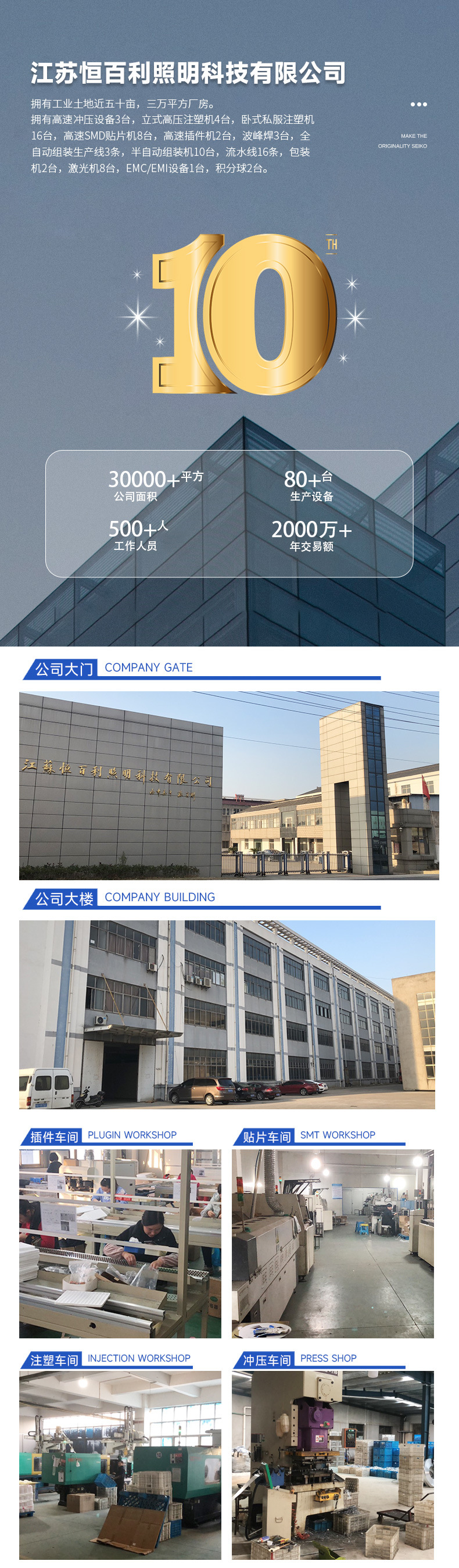 江苏恒百利照明科技有限公司成立于2014年,是一家专业为LED照明灯具的设计, 研发,制造,服务的公司。公司坐落于美丽的太湖之滨------宜兴新庄工业区,拥有工业土地近五十亩,三万平方厂房。科研技术人员25名,生产管理人员15名,设计员5名,操作工300名,可达生产总值约5亿人民币。 本公司拥有完善的LED照明灯具工艺,从铝材散热器,塑料灯罩外壳,PCB贴片,驱动设计插件,彩盒生产,到组装成品包装,囊括了除去封装外的所有LED照明灯具生产工艺。公司拥有高速冲压设备3台,立式高压注塑机4台,卧式私服注塑机16台,高速SMD贴片机8台,高速插件机2台,波峰焊3台,全自动组装生产线3条,半自动组装机10台,流水线16条,包装机2台,激光机8台,EMC/EMI设备1台,积分球2台。