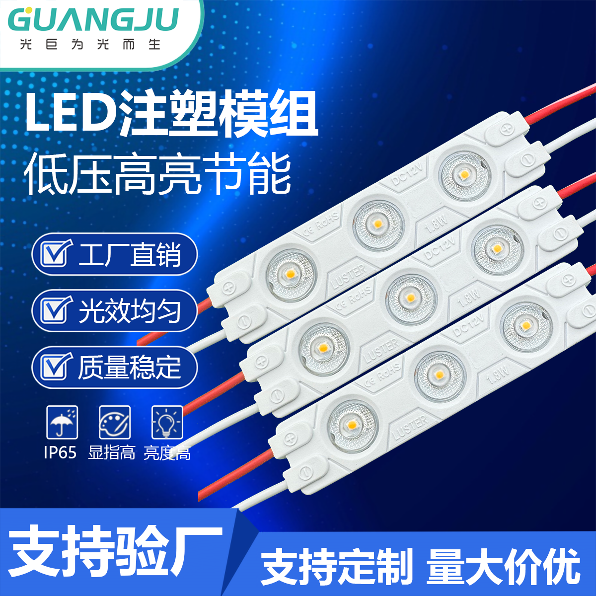 广州光巨光电专注于连锁广告光源的制造与研发,核心能力是提供更稳定、更省电、更安全、便健康的LED光源。产品通过CE、ROHS、质检等认证报告,广泛应用在“中石化、中石油、银行,手机、4S店、轮胎、鞋、服装等世界500强连锁的广告招牌、发光字、灯箱内。重大项目有:为广州南站广告灯箱、广东卫视“技行天下”“硬汉”栏目等提供LED光源;产品品类齐全、交货快、能给客户提供技术支持和解决方案等服务。广州光巨光电期望通过创新与专注能影响到连锁广告光源光环境的技术发展,并帮助我们的客户提高在国际上的核心竞争力,与行业,与客户一同成长!
