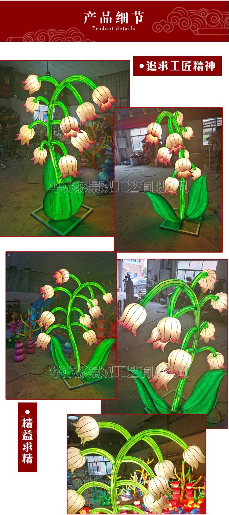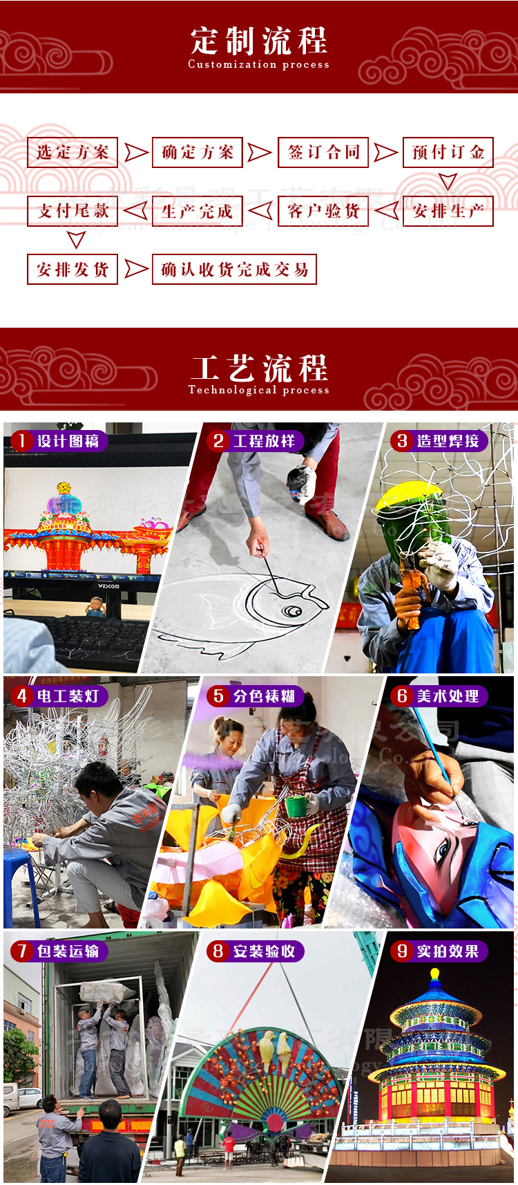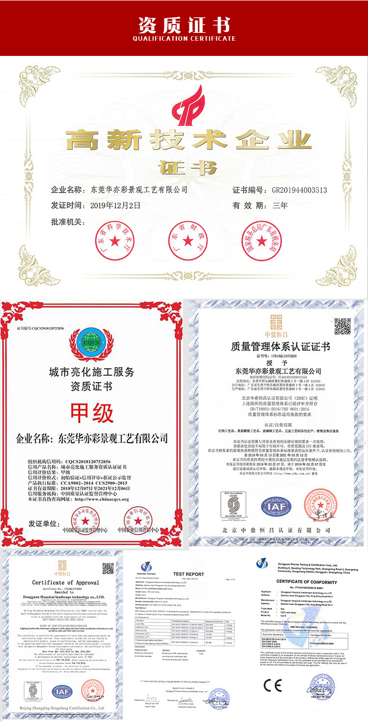 国家高新技术企业东莞华亦彩景观工艺有限公司,灯饰源头工厂,承接传统彩灯花灯制作,提供一站式灯饰工程解决方案,灯会灯展策划筹备运营;我们有研发,策划设计、制作安装,灯展运营的团队!主要业务包括:花灯制作、灯饰工程、民俗灯会、彩车彩船、大型圣诞树、景观雕塑;仿真雪景布置、商业美陈、铁艺灯饰工艺品制作。公司传统花灯工艺品更是远销欧美、中东、南美及东南亚;由于工艺精湛服务周到深受海外市场的青睐!欢迎各界朋友和我们建立并发展良好的业务关系,本公司期待与您的合作!我们愿去到全国乃至全球任何一个地方,为客户量身现场制作。这些年我们服务足迹几乎遍布所有建交的国家和地区。积累了丰富的外出制作经验和进出口、以及沟通交流、涉外合作的经验。强大的企划设计团队,免费为客户提供专属的设计方案,出具直观的效果图。强大的制作、安装、维护以及灯展运营团队为客户落地精益求精的项目工程。在技术团队配备上我们有技术总监、大美、雕塑师、造型师、钳工,焊工、喷涂工、电工、裱绣工、美工、画工、模具工、每一个工种负责不同的工艺。完整的工种配备使我们有信心不负每一位客户的信赖。俗话说术有专攻,要想把工艺做好要好的团队通力协作才能完成;智慧的您选择我们是明智之选。